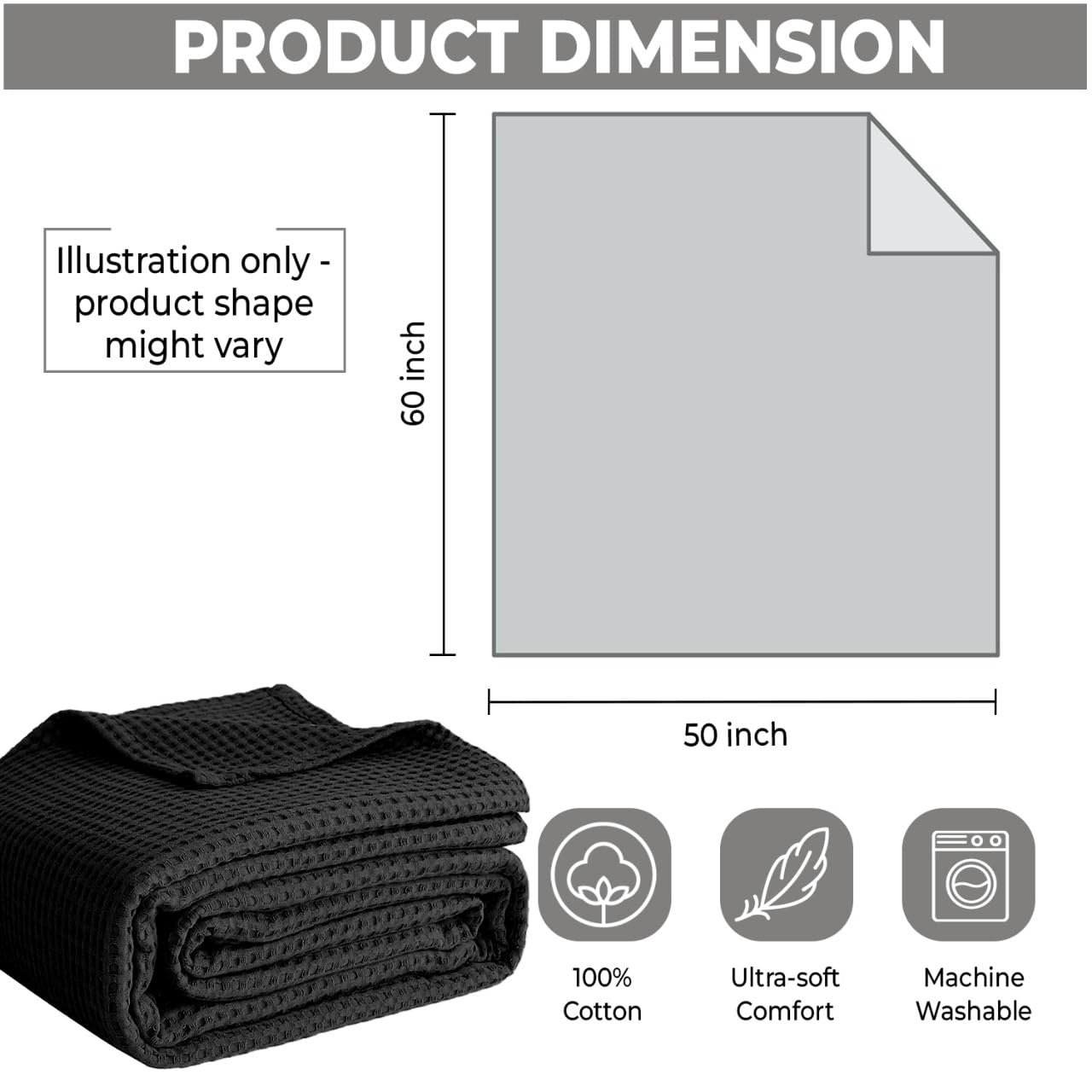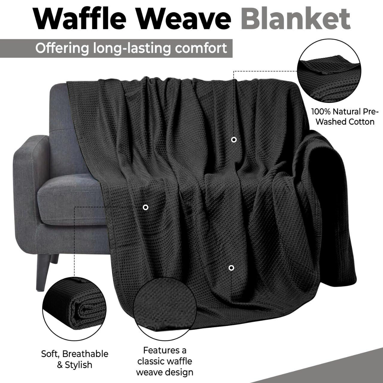 100% Cotton Blankets Throw Size for Bed – Waffle Weave Blankets for Summer, Lightweight and Breathable Soft Woven Blanket for Spring, Black, Throw (50″ x 60″)
