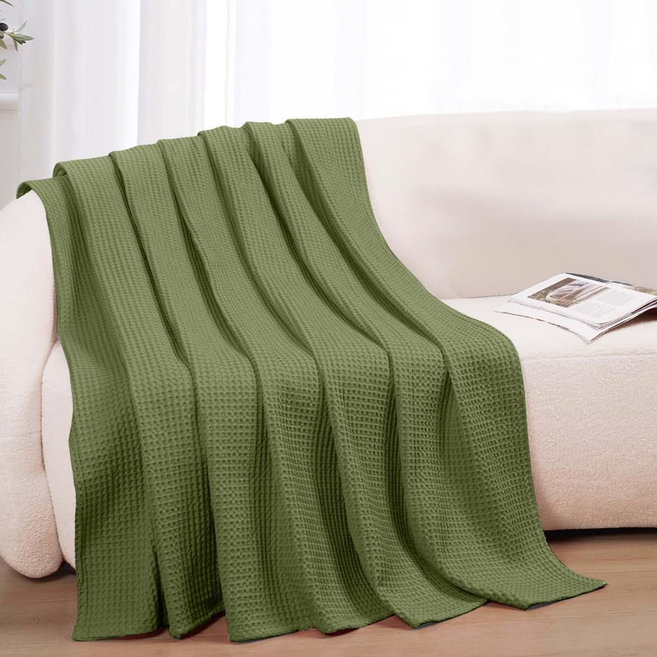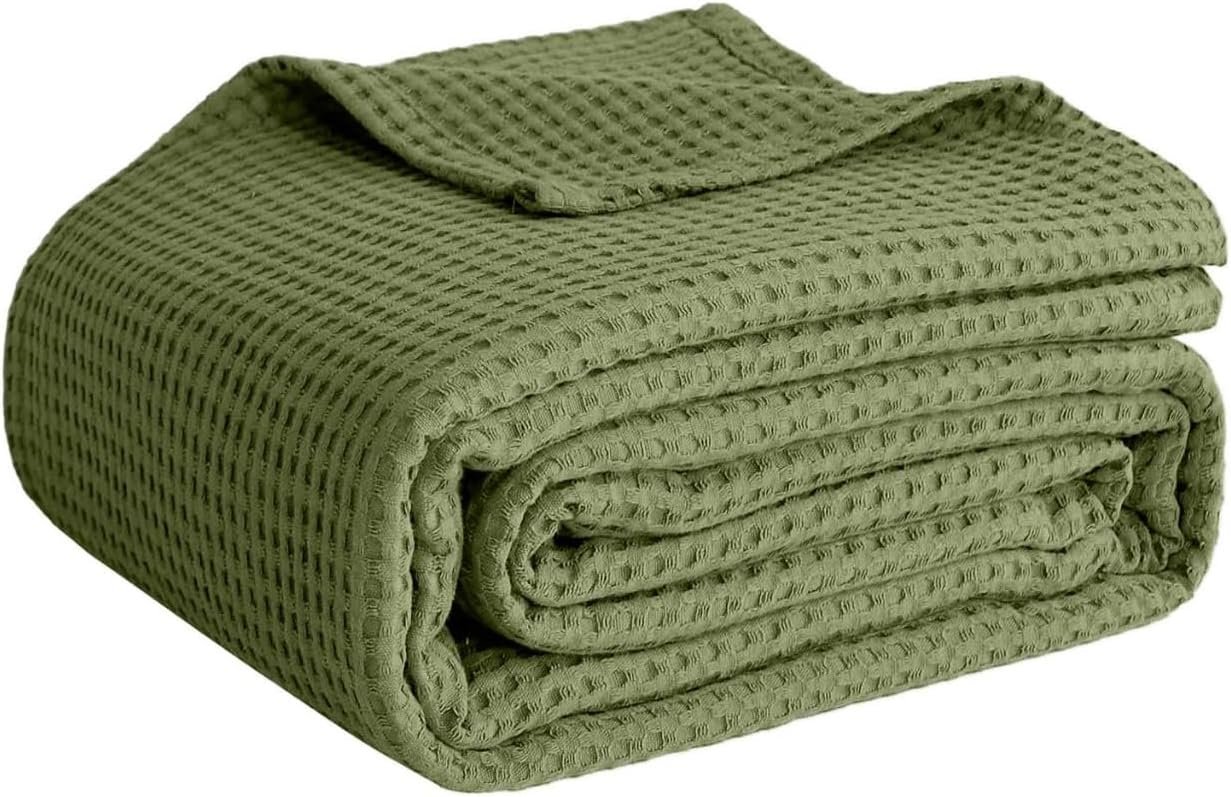 100% Cotton Blankets Throw Size for Bed – Waffle Weave Blankets for Summer, Lightweight and Breathable Soft Woven Blanket for Spring, Olive Green, Throw (50″ x 60″)