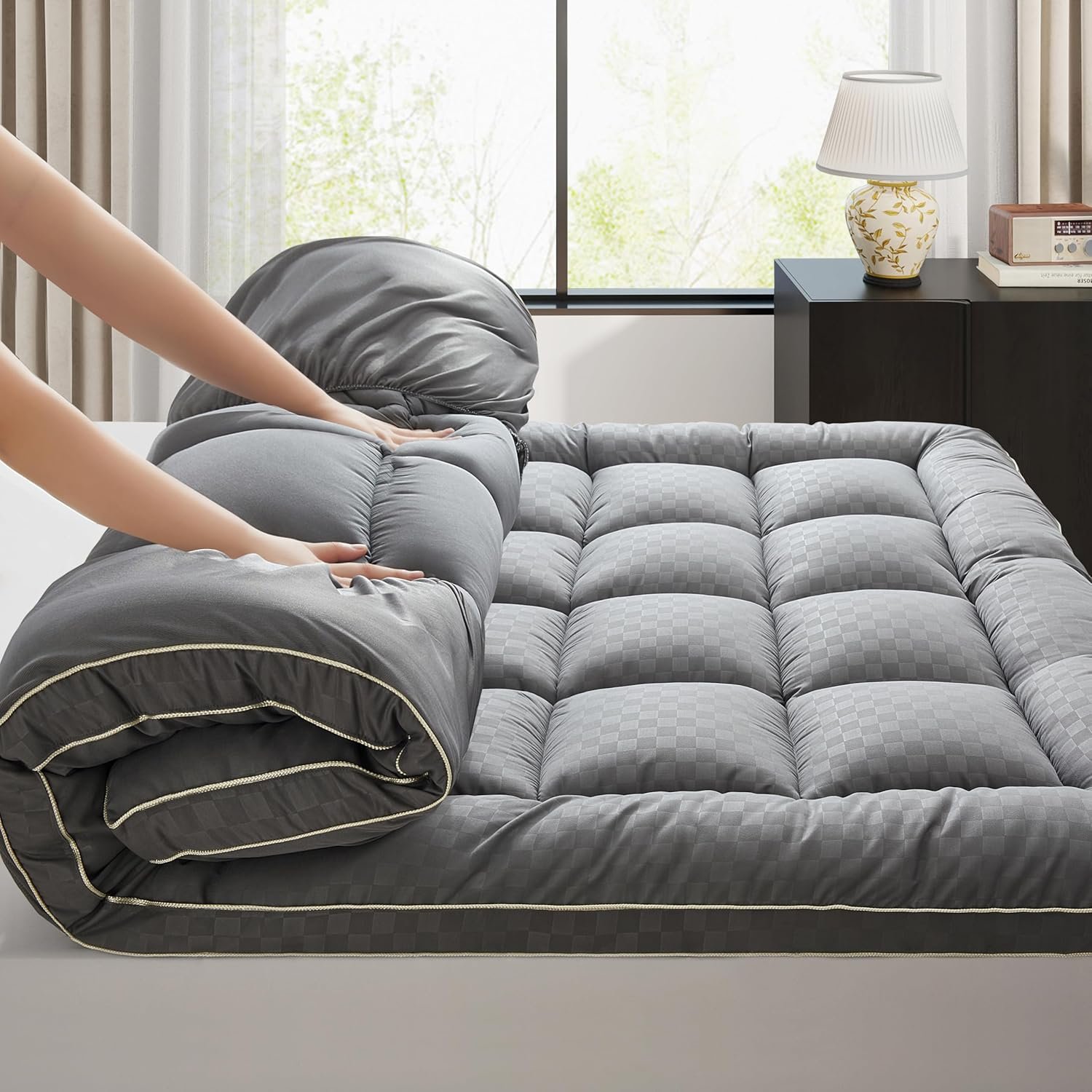 - 【Easy Care & Durable Machine Washable Design】Maintaining fresh bedding is effortless with this fully machine washable mattress pad. Innovative baffle-box stitching locks the overfilled fiber in place, preventing shifting and clumping. After each wash, it returns to its original plush, fluffy state—far easier to care for than bulky memory foam alternatives