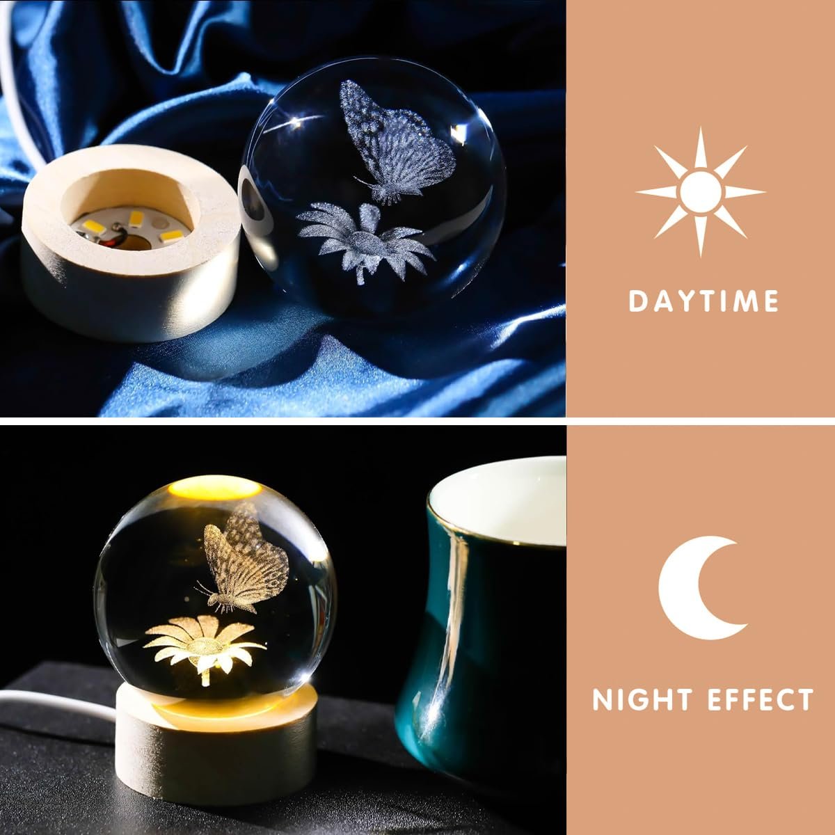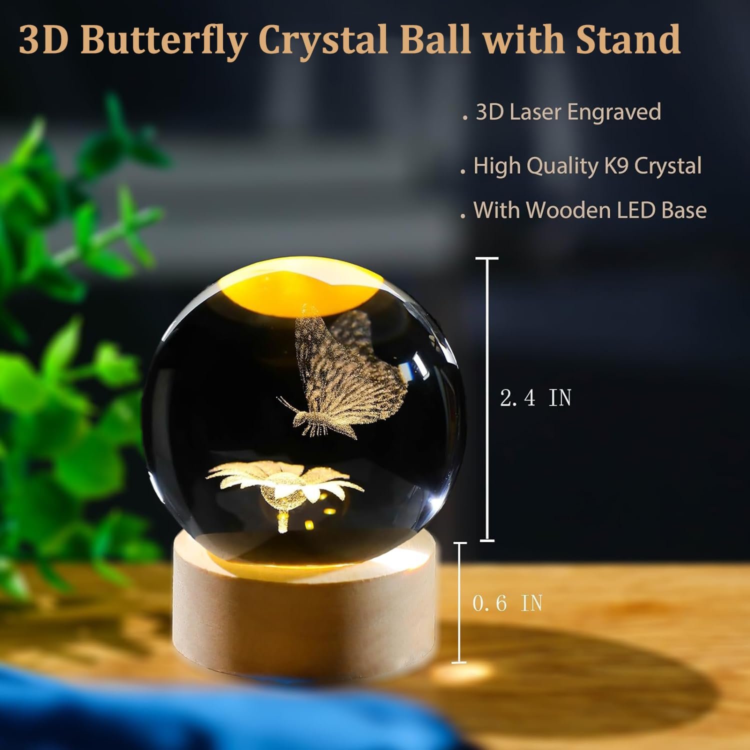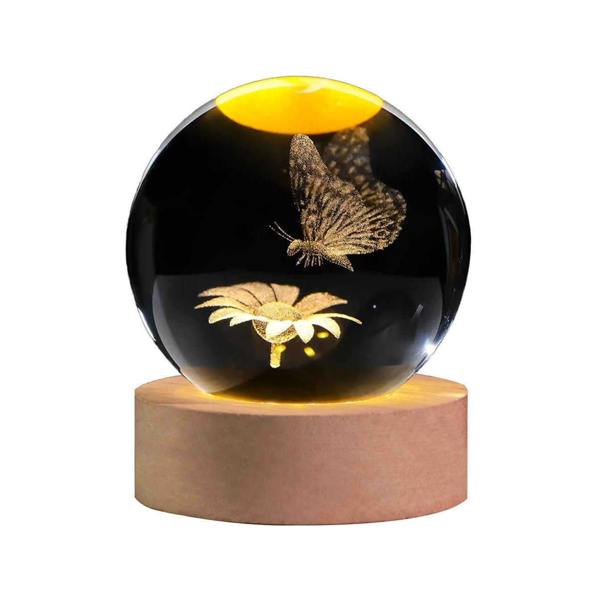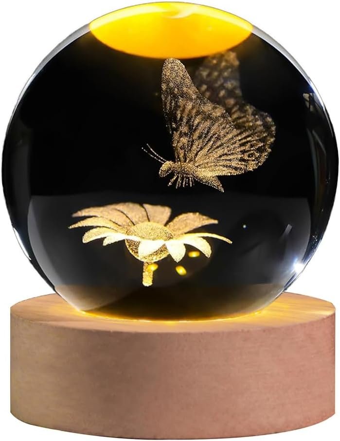 | Included Components | 3d laser engraved butterfly sunflower crystal ball, LED light wooden base with USB cable |