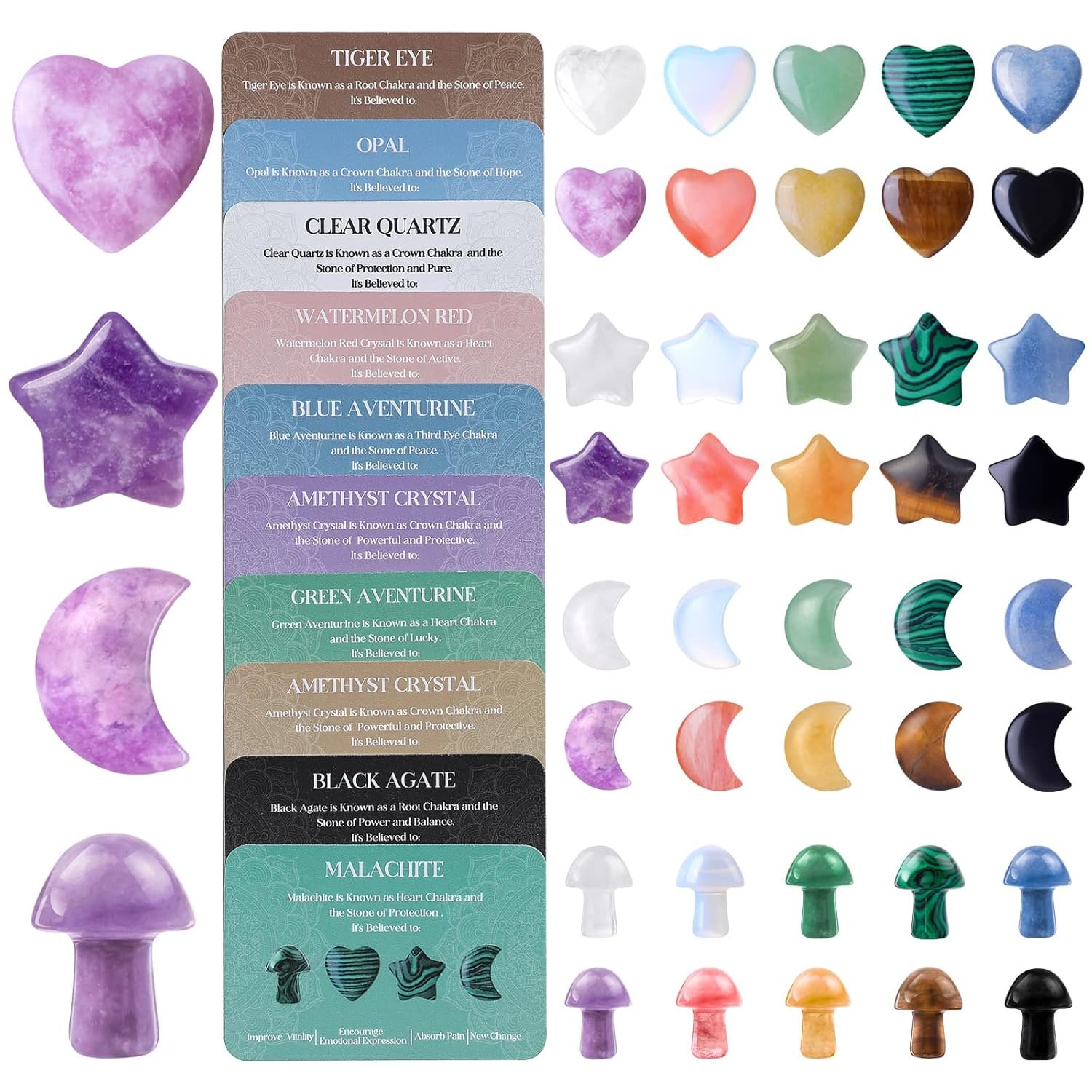 40 PCs Crystal Heart Moon Star Mushroom Shaped Natural Healing Worry Stones Bulk Polished Love Gemstones Handmade Pocket Set Bulk Balancing Meditation Mother’s Day Christmas Gift
