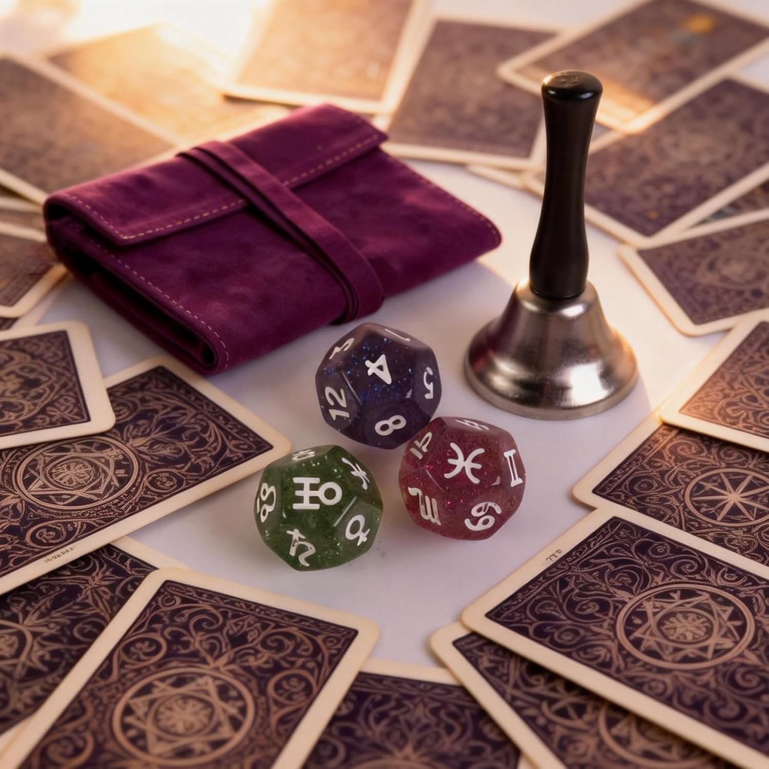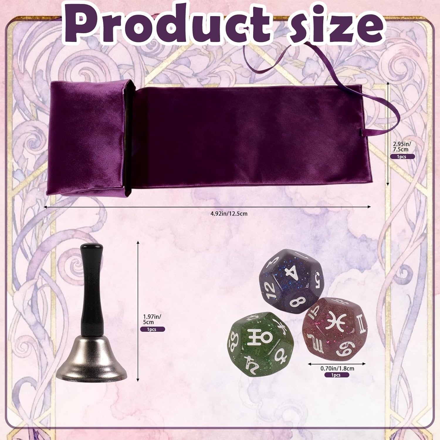 This is a nice tarot supplement set, which opens up some other options beyond just a typical tarot reading. These items all can be used to enhance your layout in a variety of ways. It’s all useful and works together well. The set comes with a bag, three 12-sided dice, and a bell.