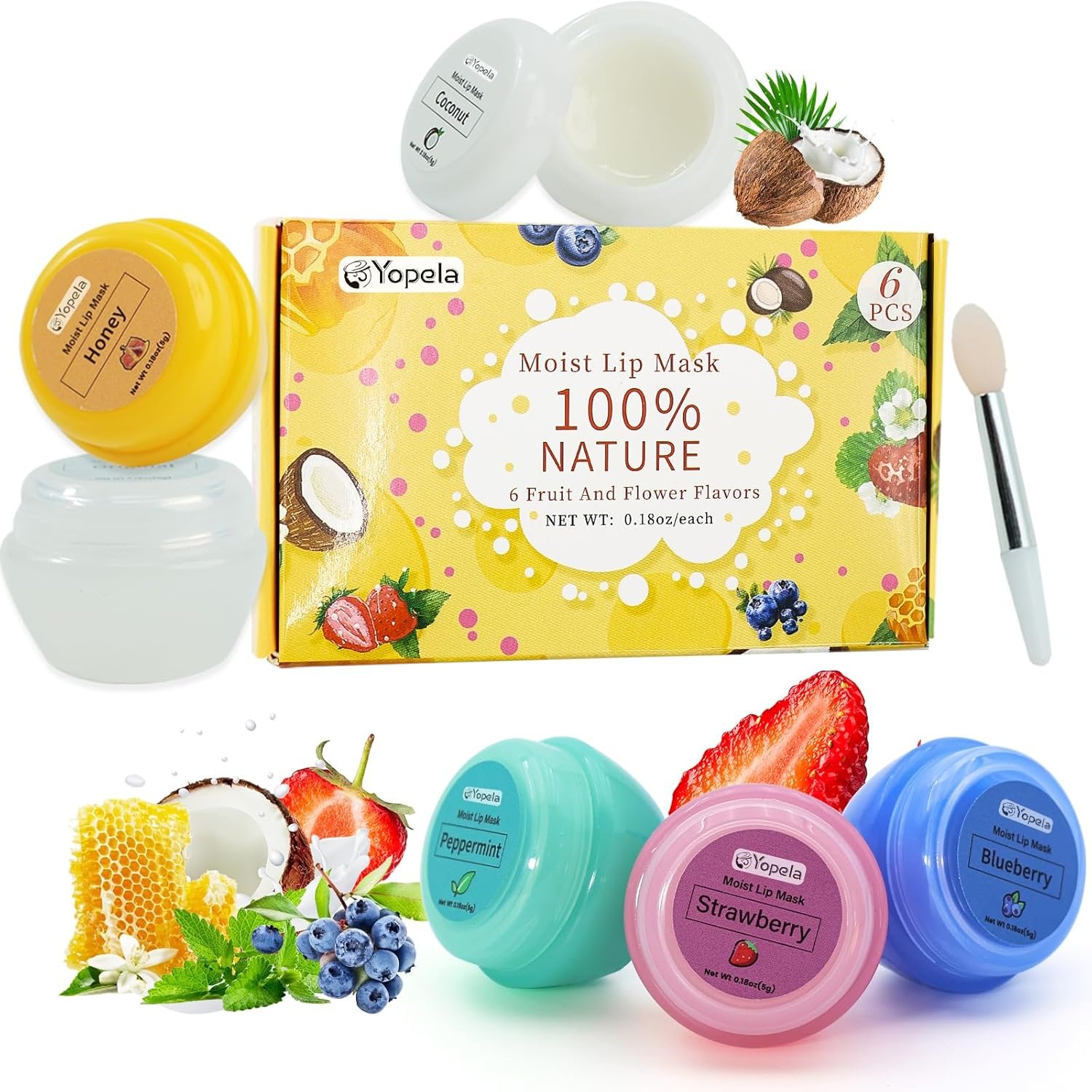 - 6 Fruit and Flower Flavors – Pink strawberry flavor, light blue blueberry flavor, blue mint flavor, lemon yellow wasp honey flavor, transparent original flavor, white coconut flavor.Each color of these lip mask represents a taste