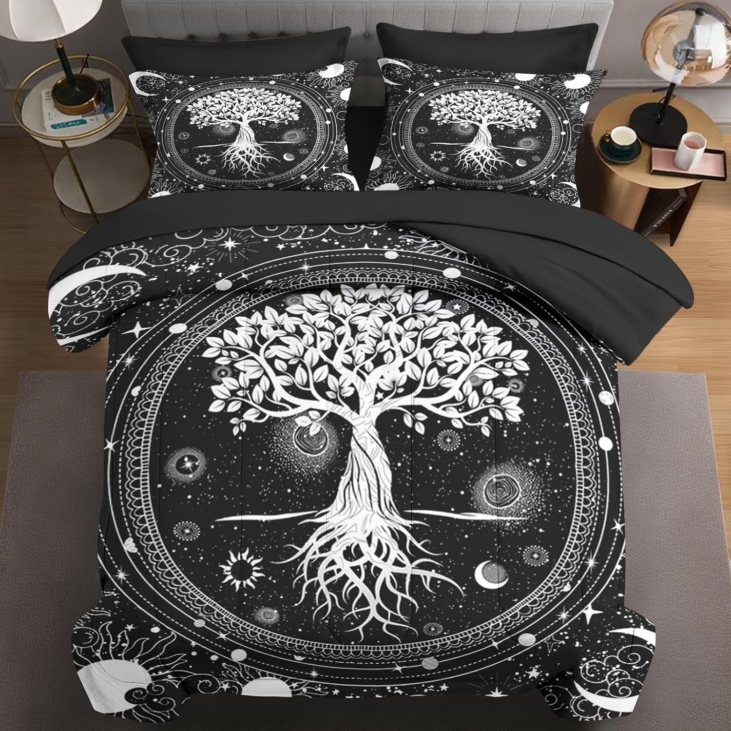 21 reviews for 7 Pcs Queen Size Comforter Set with 2 Pillowcases & 2 Shams, Black Gothic Tree of Life Bedding for Kids and Adults, Nature Sun and Moon Bed in a Bag with Flat Fitted Sheet