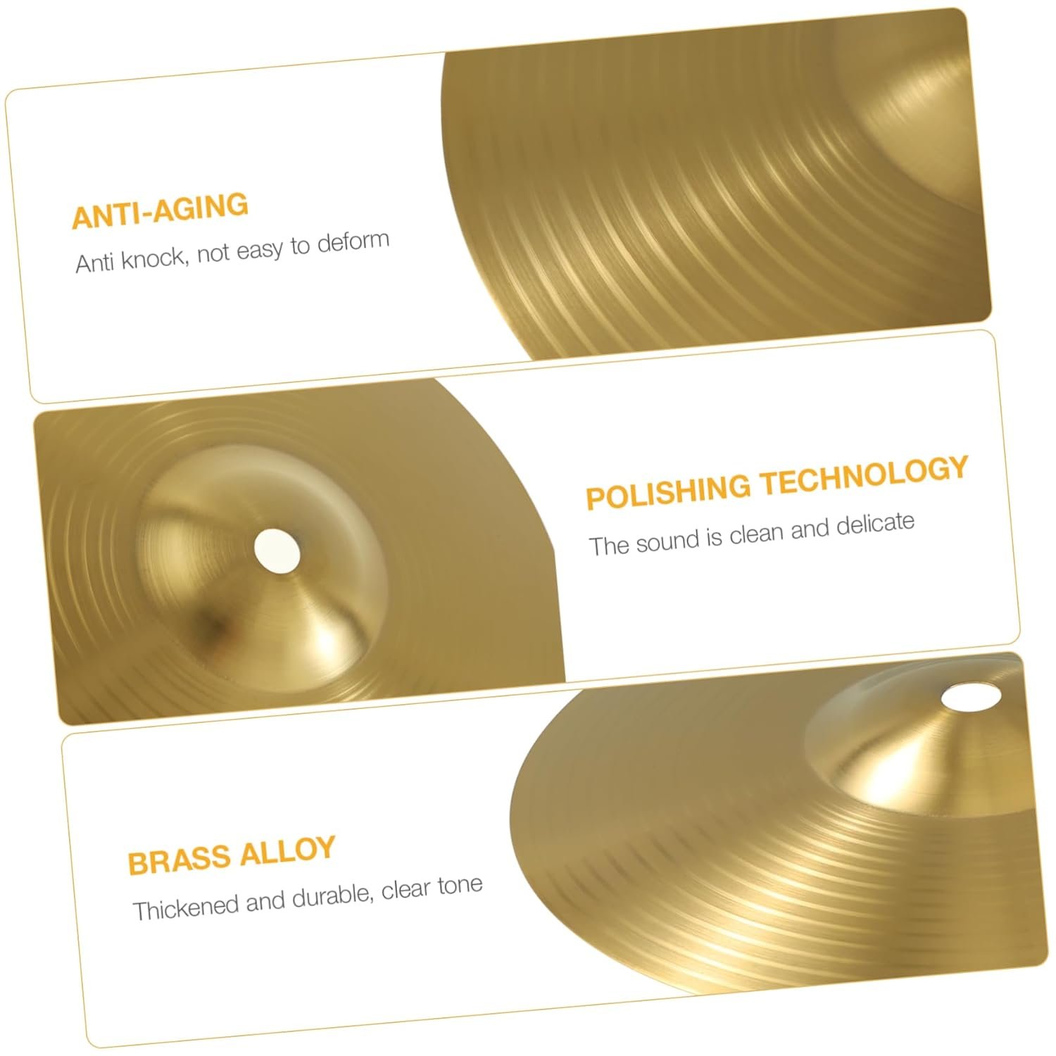 I didn’t really expect much when I ordered this. I wanted a hi hat size cymbal to use as light ride with an expanded cajon kit, and I am not a trained drummer. The first set had a small dent in the edge of one cymbal. Amazon and the Seller swapped it out quickly, but the second set came with a dent as well. In fact, after using it on one gig, the second cymbal was also dented. I have since learned from a drummer why these pressed brass cymbals give a tone more like Chinese Opera, and are so light weight. A real Turkish style cymbal is made by coiling brass strands in a circle, then cooling and elaborate polishing. So it is what it is.