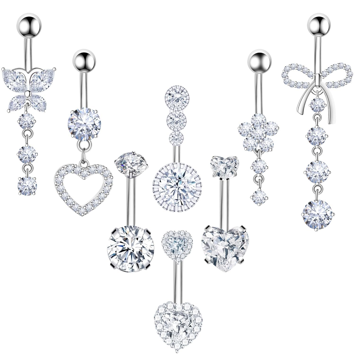 8Pcs Gold Pink Silver Belly Button Ring Dangle Navel Belly Piercing Jewelry Cute CZ Butterfly Heart Flower Bow Navel Belly Rings for Women 14G Hypoallergenic Surgical Stainless…