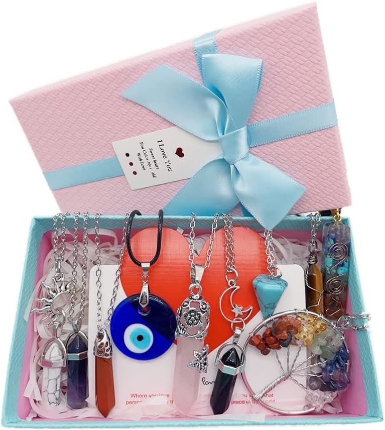 44 reviews for AITELEI 10 Pcs Crystals Pendant Necklace for Women – Chakra Healing, Tree of Life Wire Wrapped Healing Crystal Stone, Evil Eye, Hexagonal Crystal, Sun Moon Pendants