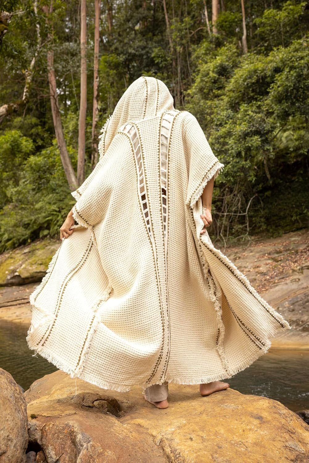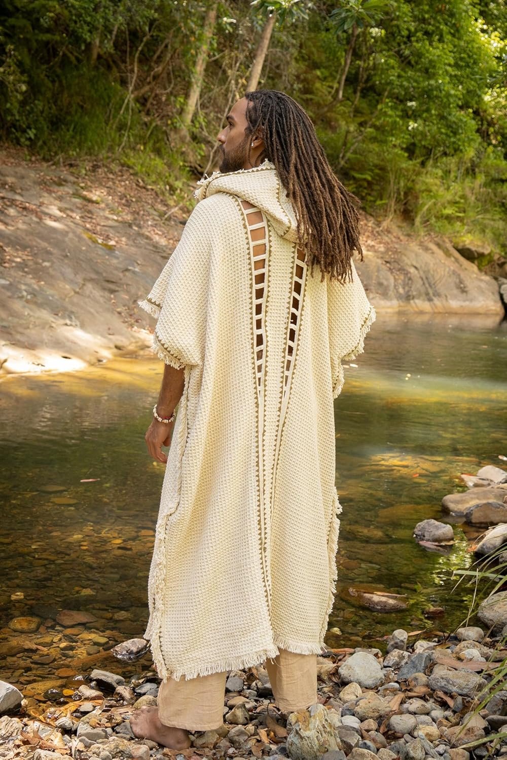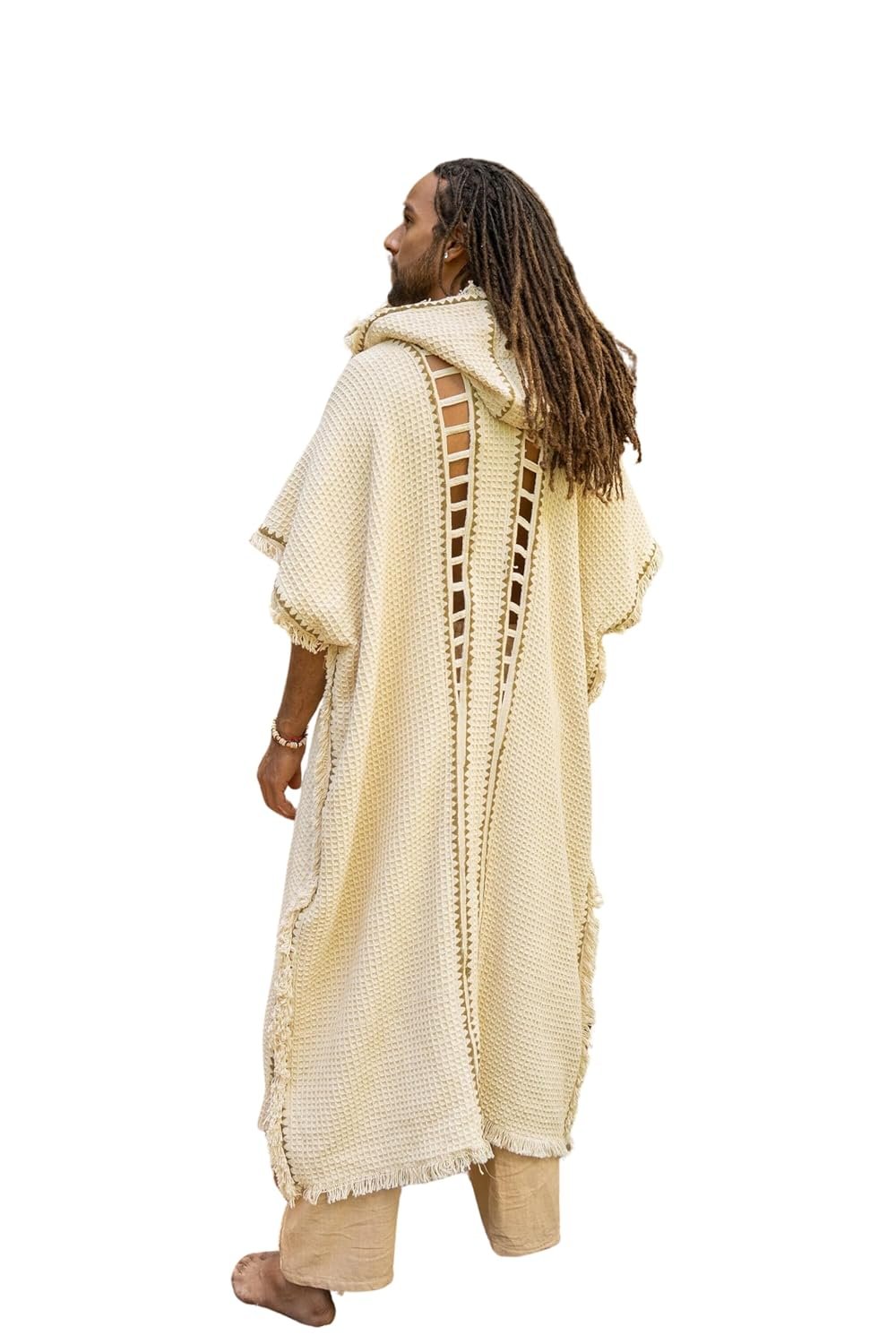 AJJAYA MAGOS WIZARD Long Mens Hooded Kimono Ivory Beige Tribal Ritual Ceremony Gypsy Magic Ritual Primitive Rave Boho