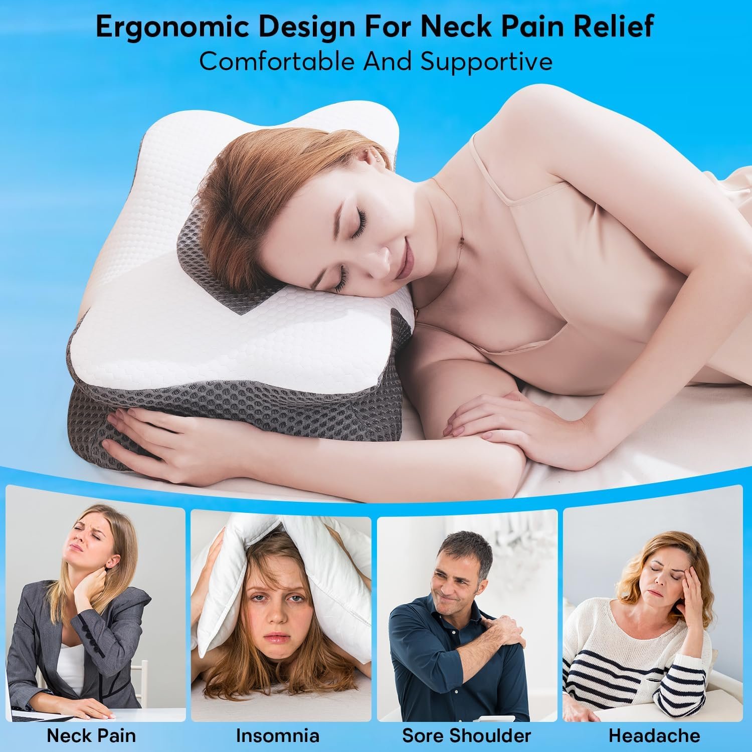 - 【EXPERIENCE UNRIVALED PRESSURE RELIEF】Our cervical pillow helps to provide you with a great night’s sleep, so that when you wake up you feel relaxed, and full of energy, you will feel less tension on your neck and shoulders, due to the relaxing night’s sleep it provides, you will be able to notice that you can fall asleep more quickly, and are able to have an undisturbed, sleep throughout the night