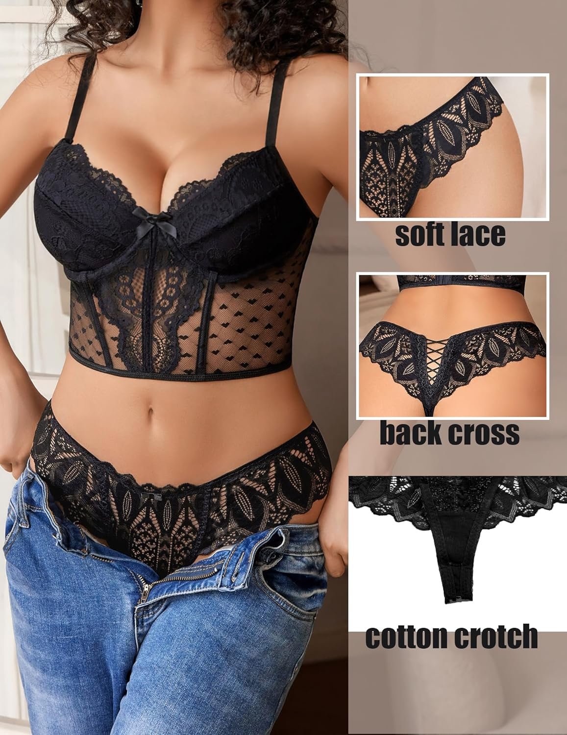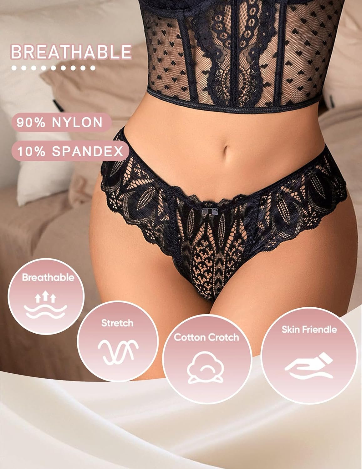 - Thongs for women features light lace edge with no line, which can avoid the embarrassment of underpants sticking out of tight-fitting pants or skirts. The cotton crotch is soft and comfortable that can protect women’s private parts. The low waist, cross back design of this cheeky panties well show your sexy curve, make you more charming and elegant.