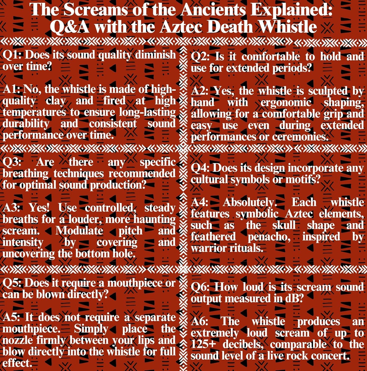 This product came on damaged and well packaged. It is amazing at creating a screaming sound and I have used it constantly and songs and for scaring my sister-in-law. It is beautiful and it is something that I really do like looking at during my day. Overall if you want an Aztec death whistle this works very well.
