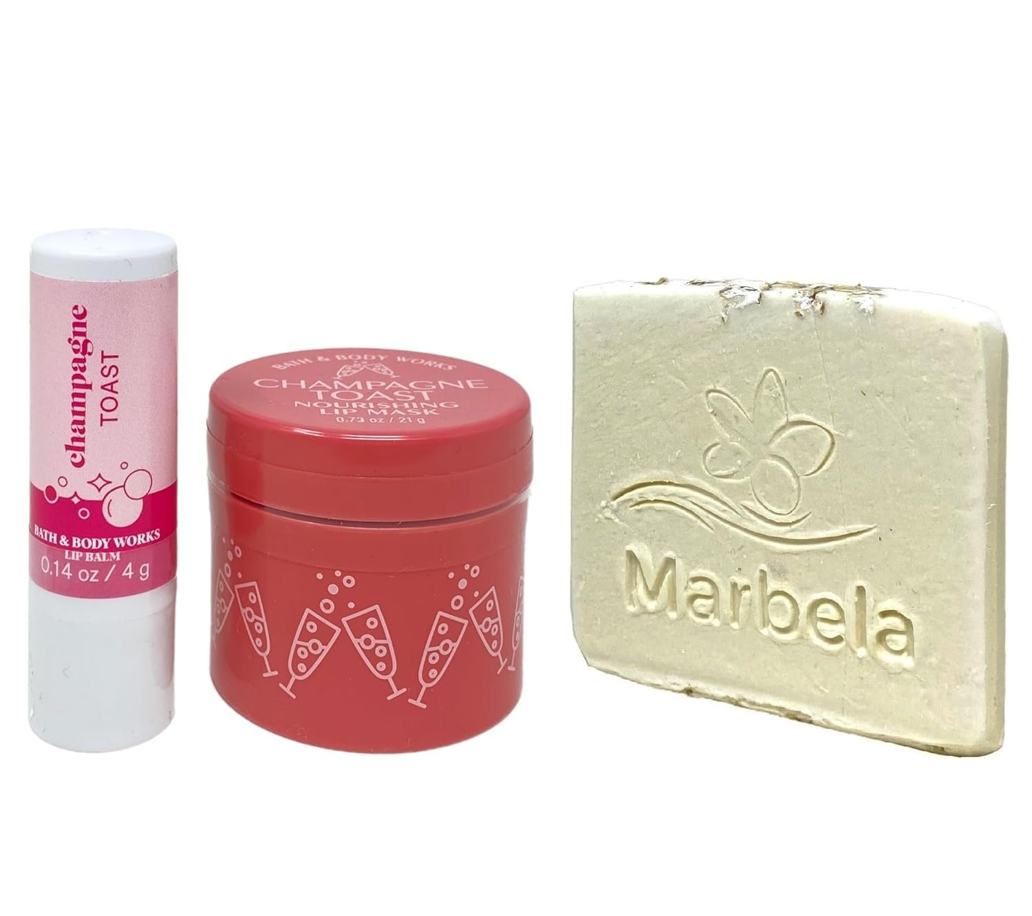 - Bath & Body Works Champagne Toast Lip Care Duo Set with a Marbela Natural Oats Sample Soap (Soap May Vary).