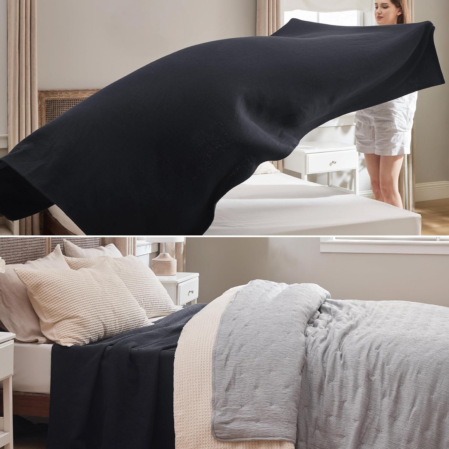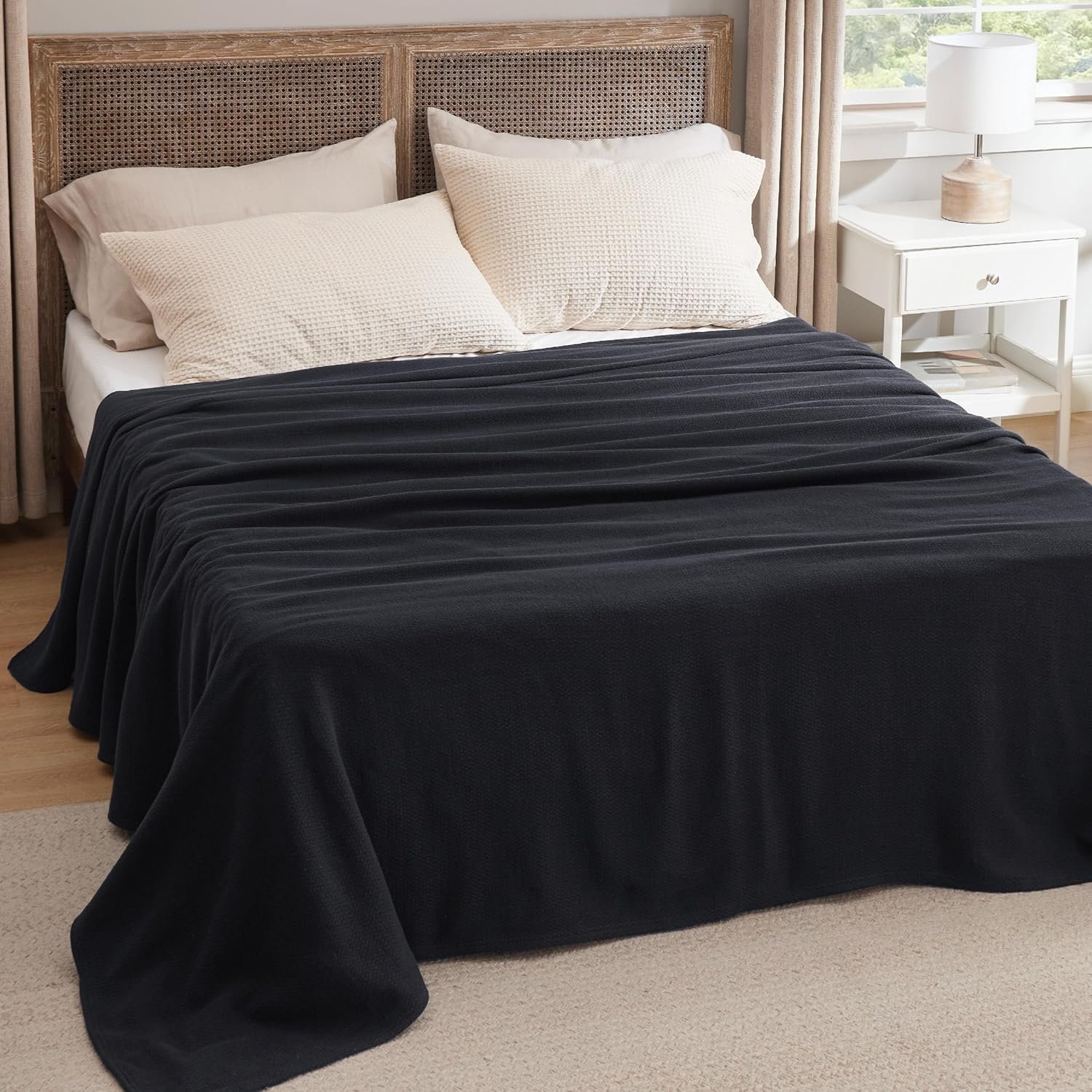 Bedsure GentleSoft 100% Cotton Blanket Queen Size for Bed – Breathable and Lightweight, Soft Cozy Textured Herringbone Woven Blanket for Summer, Black, 90×90 inches