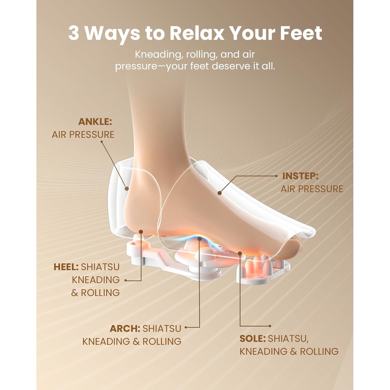 - All-in-One Relaxation Powerhouse: Unwind with kneading, shiatsu, and air compression massage techniques, featuring 3 intensity levels (low, medium, high) for total customization. Target heels, toes, arches, and midfoot to relieve tension, improve circulation, and rejuvenate tired feet. Perfect for post-workout recovery or daily relaxation, this foot massager with heat includes a 15-minute auto-shutoff for safety and convenience.Treat yourself to a spa-like experience at home!