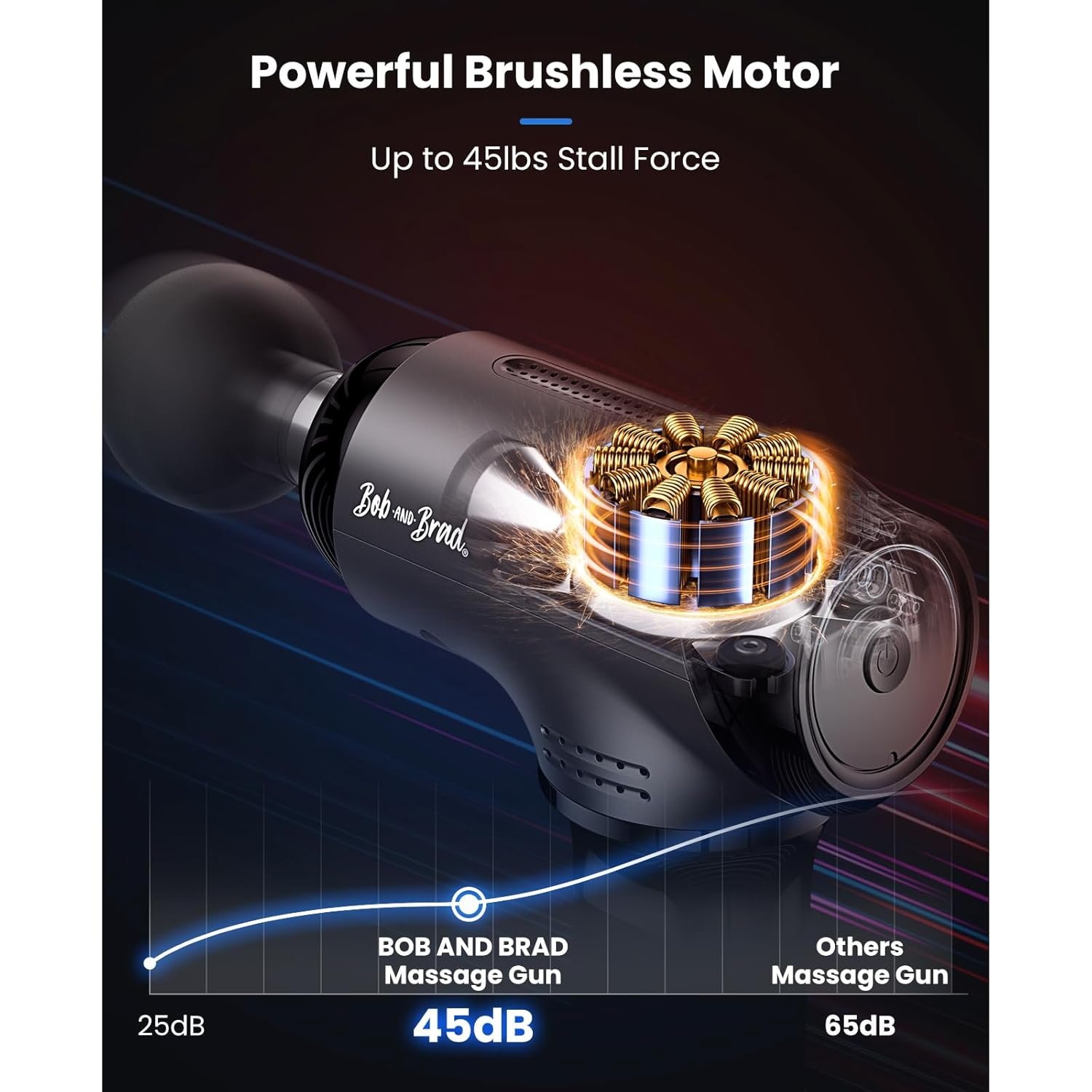 - Professional-Grade Deep Tissue Relief with 10mm Amplitude & 45lbs Stall Force: Experience next-level muscle recovery with our high-performance massage gun, delivering trigger point therapy at up to 3200 RPM and Real 10mm amplitude for effective fascia release. The powerful 45lbs stall force brushless motor provides unmatched penetration to target stubborn knots, while 5 adjustable speed levels let you customize intensity for any recovery need.