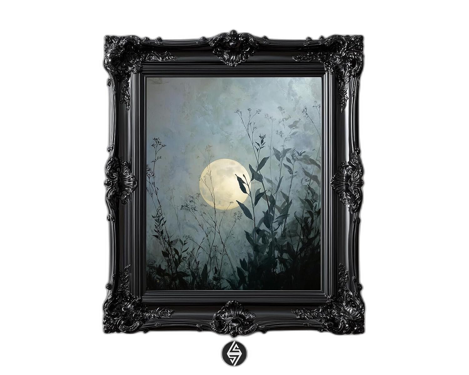 Be the first to review “Botanical Moon Wall Art Print featuring plant silhouettes in a moody night garden with lunar glow for dark academia decor” Cancel reply