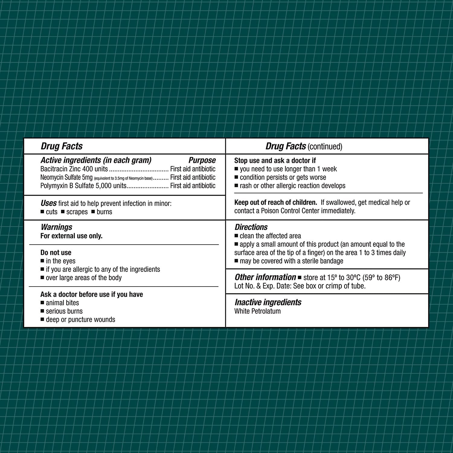 - ACTIVE INGREDIENTS Compare to the Active Ingredients of Leading Brand. Active Ingredients (in each gram): Bacitracin Zinc 400 units, Neomycin Sulfate 5mg (equivalent to 3.5mg of Neomycin base), Polymyxin B Sulfate 5,000 units.