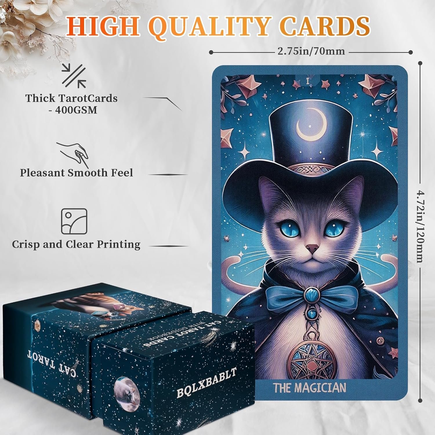 Cat Tarot Cards with Guide Book for Beginners Unique New Cute Cat Theme 400GSM Thickness Tarot Oracle Deck Kit with Guidebook Original Art with Embossed Edge