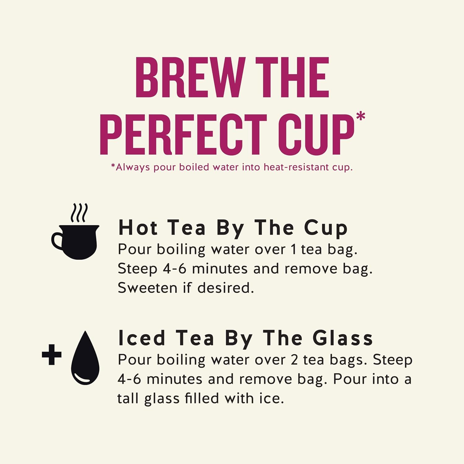 - Your Perfect Cup: Steep the tea bag in hot water for 4-6 minutes and remove the bag for comforting hot tea. Use the same process over 2 tea bags and serve over ice for a refreshing glass of iced tea.