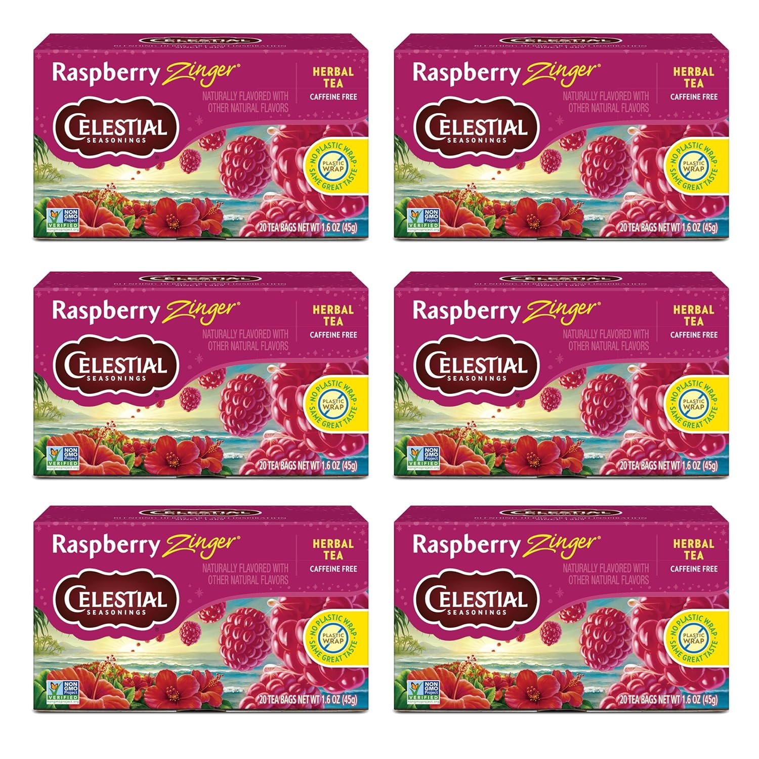 Celestial Seasonings Raspberry Zinger Herbal Tea, Caffeine Free, 20 Tea Bags Box, (Pack of 6)
