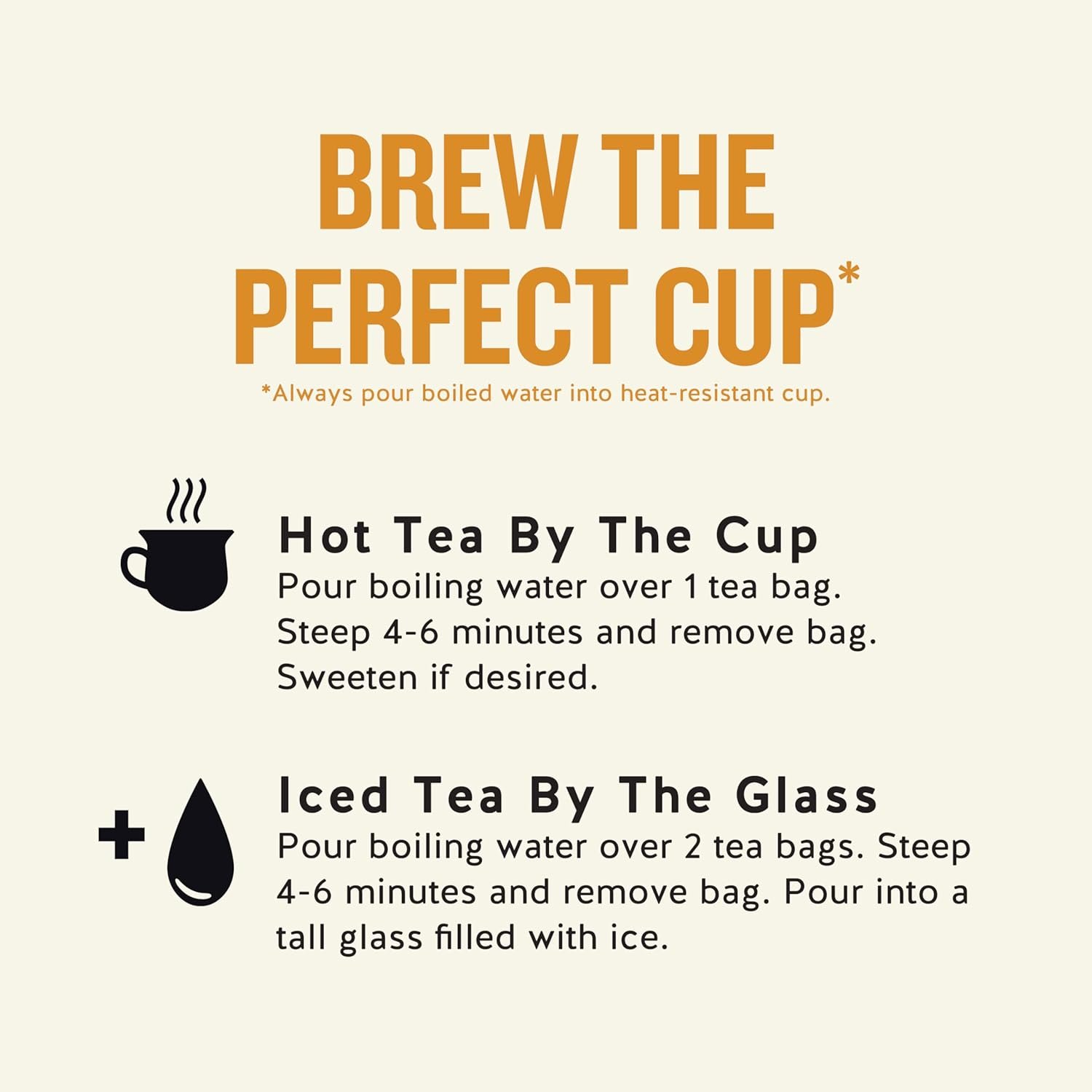 - Your Perfect Cup: Steep the tea bag in hot water for 4-6 minutes and remove the bag for comforting hot tea. Use the same process over 2 tea bags and serve over ice for a refreshing glass of iced tea.