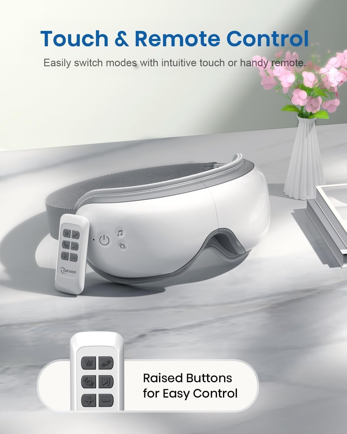 - Adjustable Air Compression with Gentle Vibration: Inspired by hand massage techniques, the adjustable compression levels softly press around the eyes and temples, helping to ease tension from daily screen use. You can also turn on the optional vibration for an added layer of relaxation.