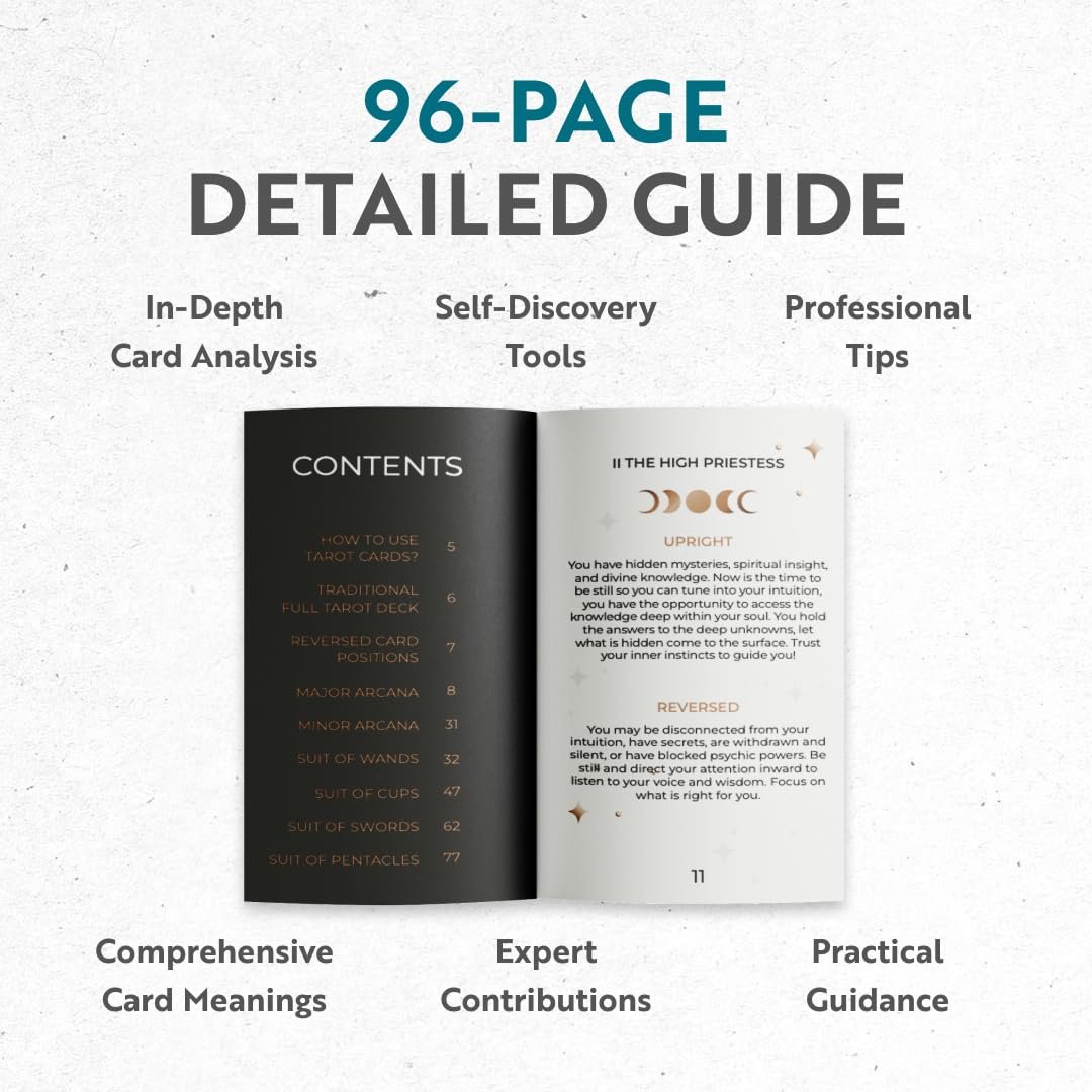 - Comprehensive 91-Page Guidebook: Whether you’re a novice or a seasoned reader, the included guidebook will walk you through the interpretations, giving insight into every card and helping you unlock the wisdom within.