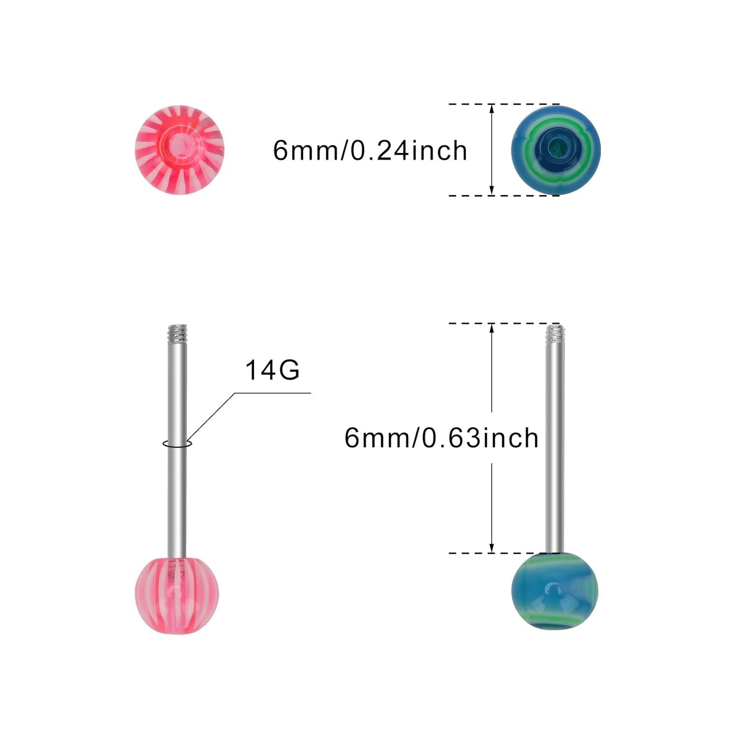 - Size: 14G barbell bar tongue ring, length: 16mm/0.63inch, the ball diameter: 6mm/0.24inch, lightweight and soft and comfortable for your daily wearing.