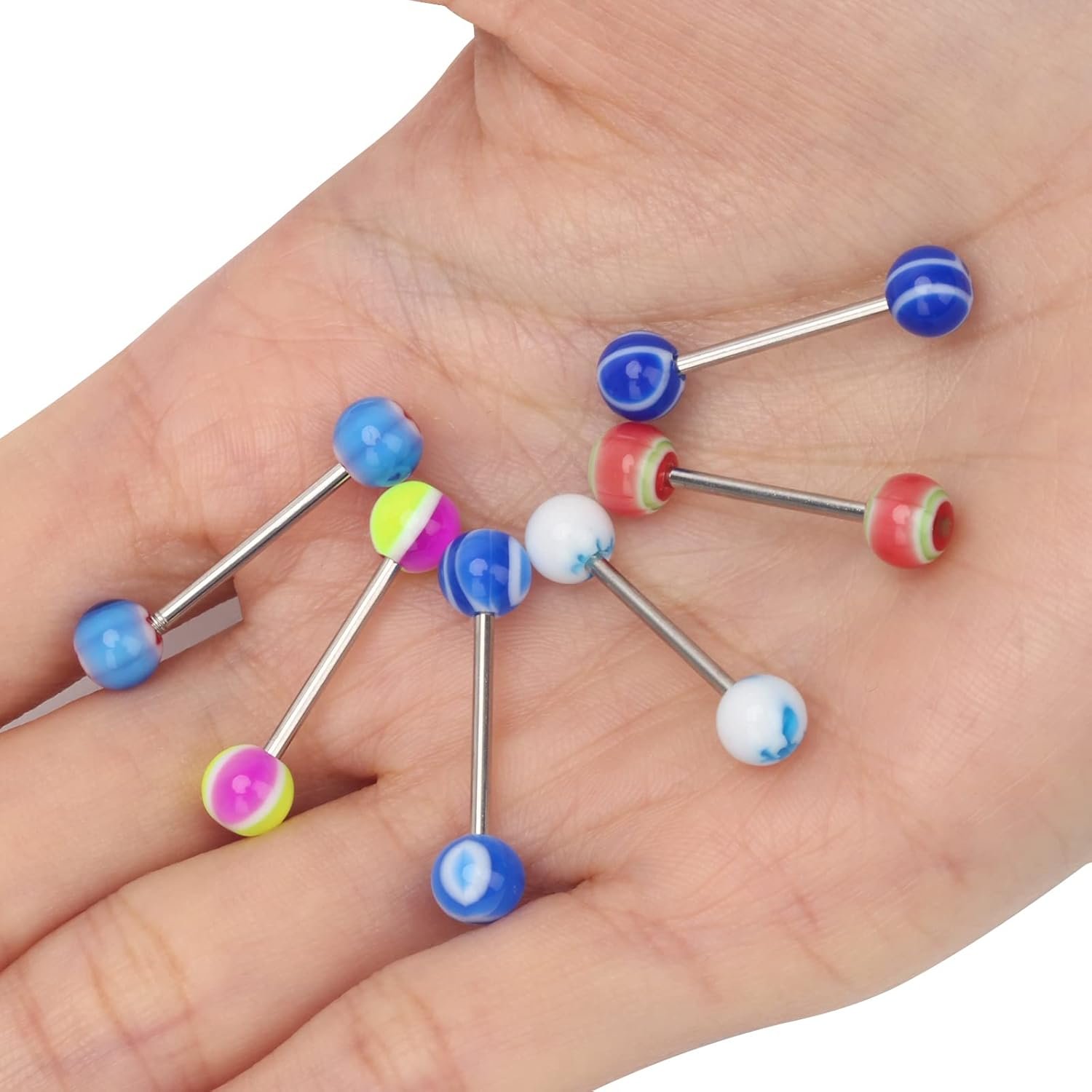 - What You Get: 100 pieces assorted tongue rings- 2 pieces of 50 different types, colorful, flexible and cute tongue rings that you can wear on different days and occasions, meanwhile, you can share clear tongue rings with your family and friends at party, graduation, birthday, Christmas and so on, express yourself individually.