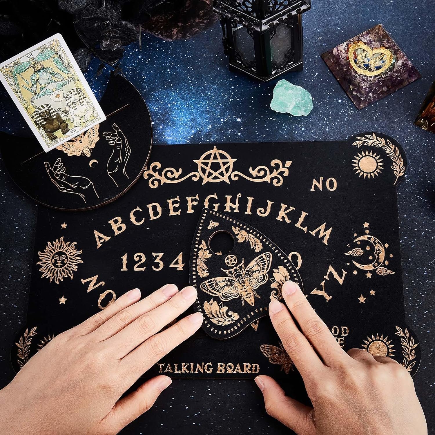 - [SPIRIT BOARD DIVINATION]: The package includes a wooden tarot card altar stand and a black board talking board with planchette. Allowing you to choose according to different questions spirit board kit has letters from A to Z, numbers from 0 to 9 and YES and NO. A movable indicator is used to answer questions raised by users. It is a way of divination to have a dialogue with the soul to ask for answers.