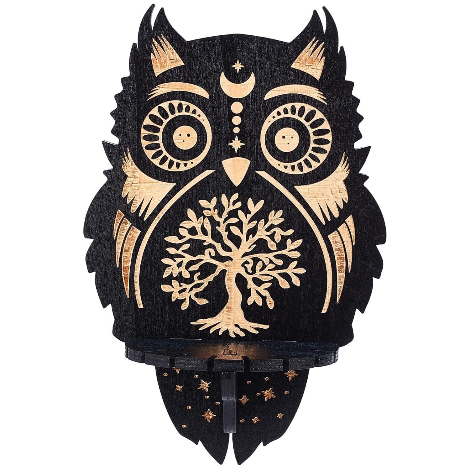 - [WOODEN CRYSTAL DISPLAY SHELF]: This witchy shelf is designed into the shape of a crescent owl, carved with tree of life pattern, artistically combined and can match with different styles of crystals, easily attracting people’s attention and blending with your home layout.