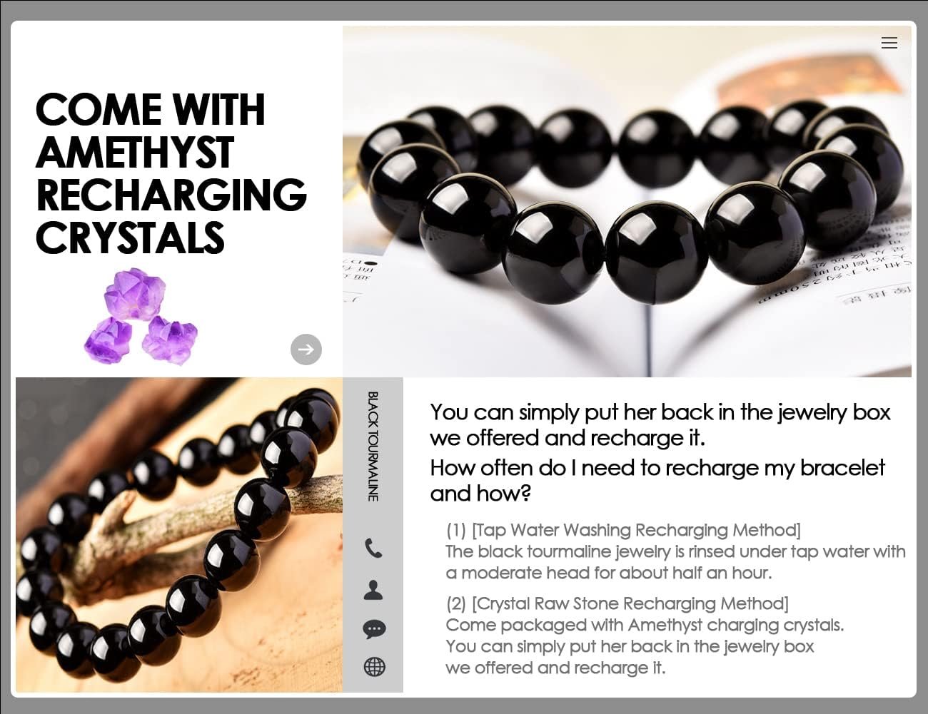 - COME WITH AMETHYST RECHARGING CRYSTALS: Black tourmaline has strong ability to weaken the negative energy, help sleep, but its own purification ability is very low, so we need to recharge it in time after use. Our Black Tourmaline Bracelets come packaged with Amethyst charging crystals for your convenieince. You can simply put her back in the jewelry box we offered and recharge it.