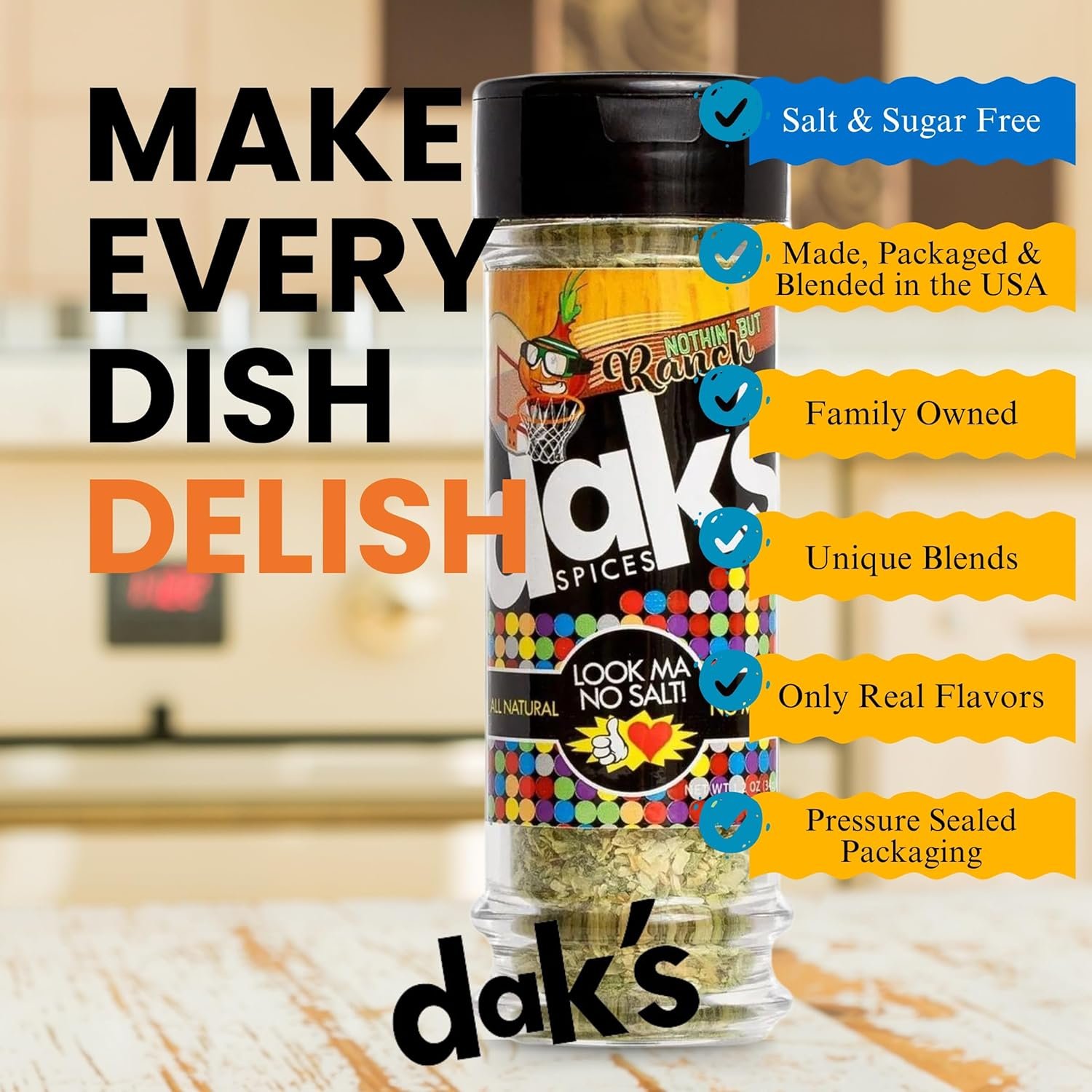 - 100% SALT FREE & SUGAR FREE – DAK’s Spices is a full line of innovative NO SALT Spice Blends. High in quality, high in flavor, low in sodium. Cut back on salt intake and enjoy a kick of bold flavor without compromising health. Our line of salt free seasonings left out the salt, but kept all the flavor. Make Every Pizza, Bagel or Wrap tastier with Just a Pinch.