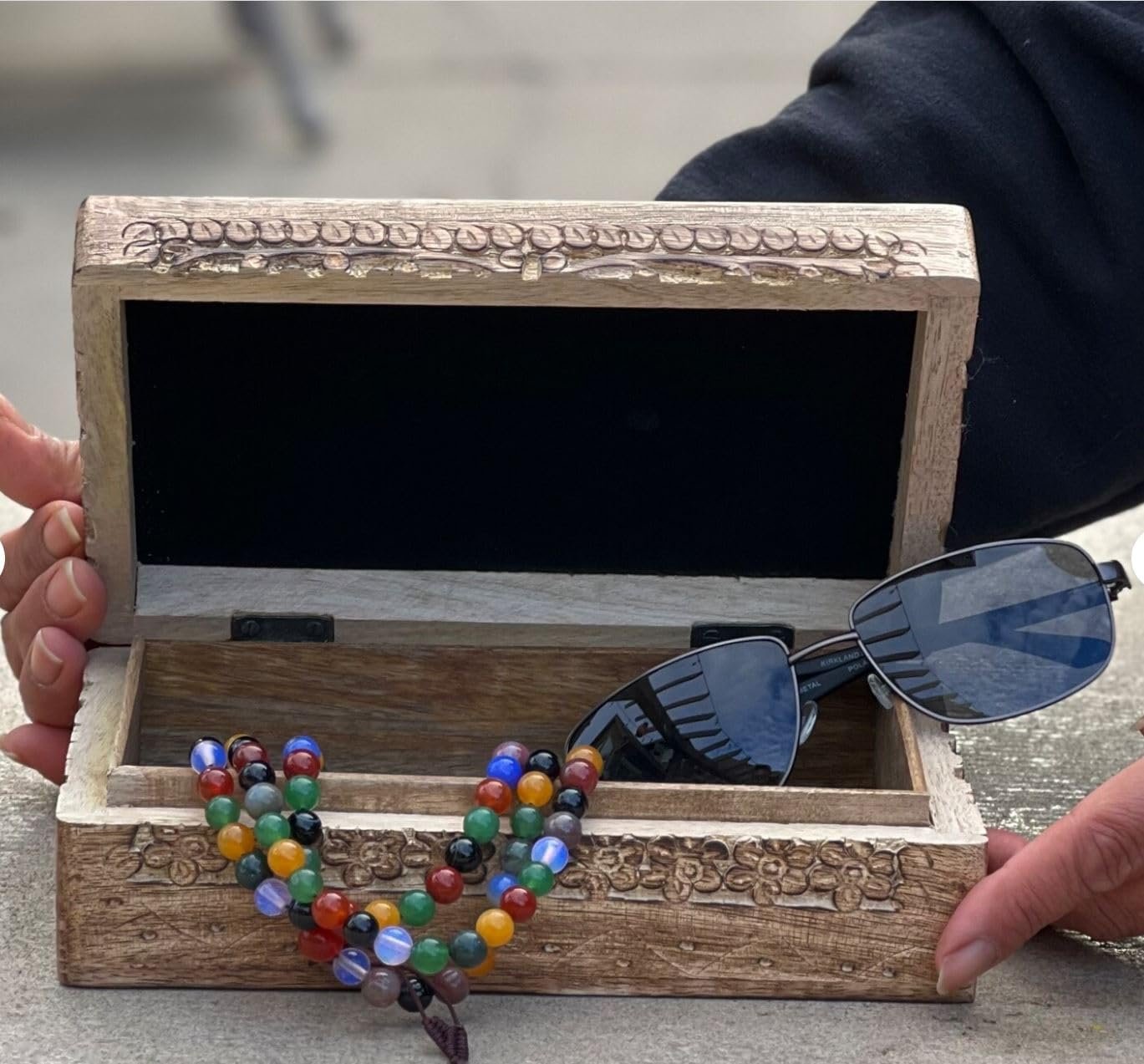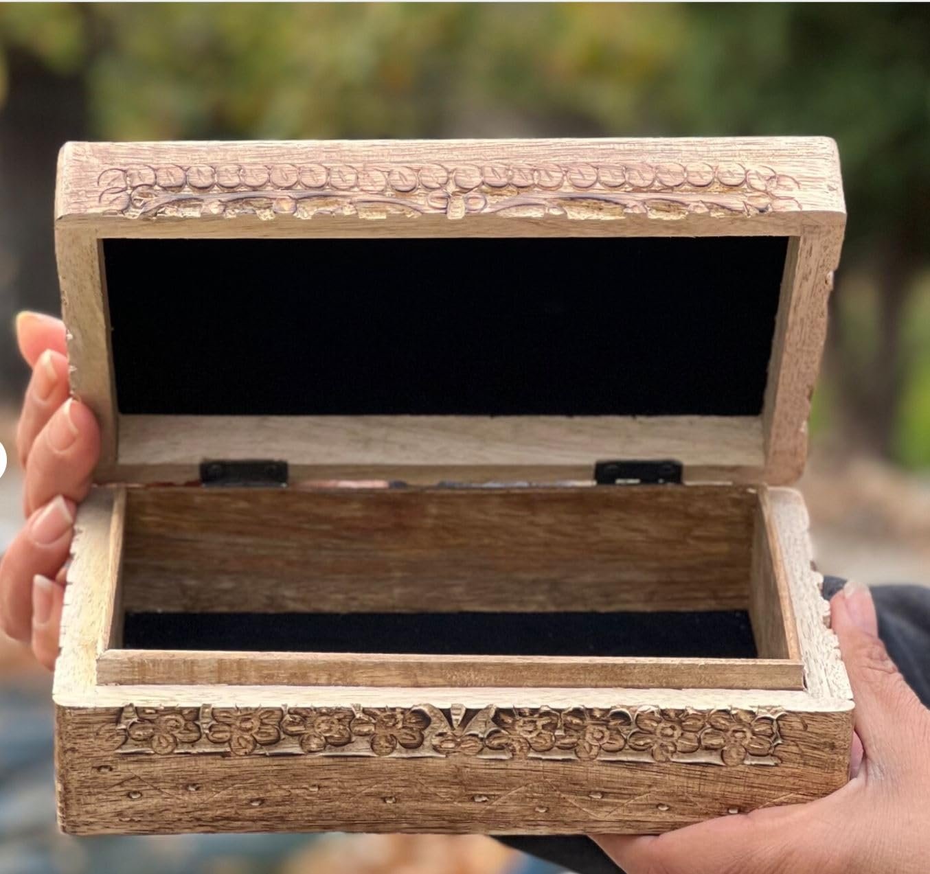- Hand Crafted and adorned with Mughal inspired hand carved Moon and Stars motif. Full velvet lining to avoid scratches for your valuables.