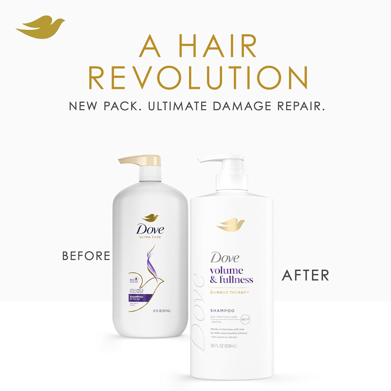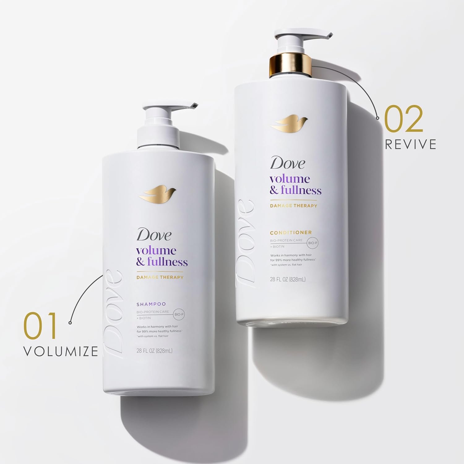 - ALL DAY VOLUME AND FULLNESS: Dove Volume & Fullness Shampoo and Conditioner system is designed for flat hair. Infused with Biotin , the Dove Volume & Fullness System leaves hair with all-day body.