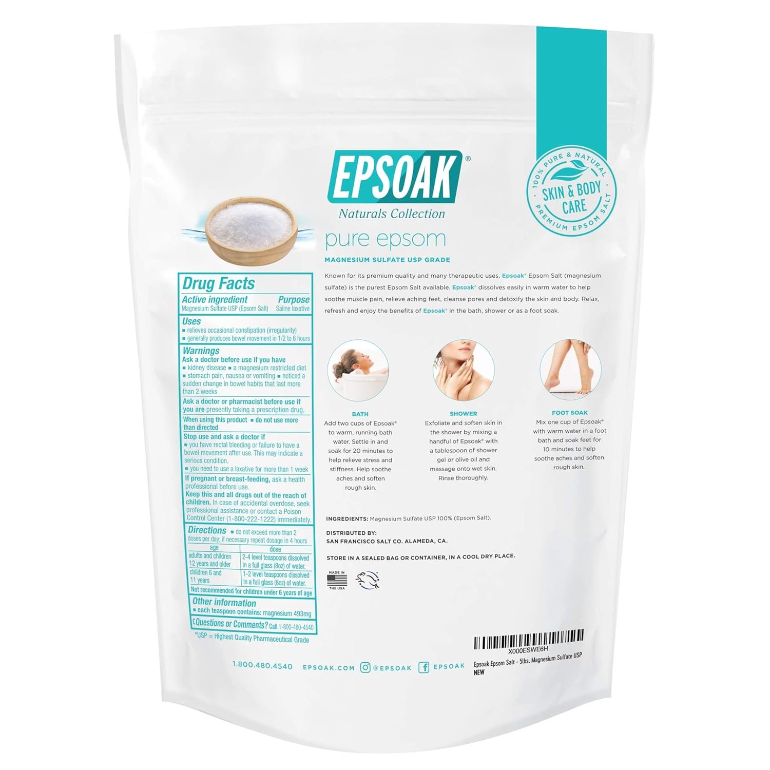 Epsoak Epsom Salt – 10 lb (Two 5 lb Resealable Bags), Magnesium Sulfate USP, Unscented, Made in USA, Perfect for Bath, Spa, and Soaking
