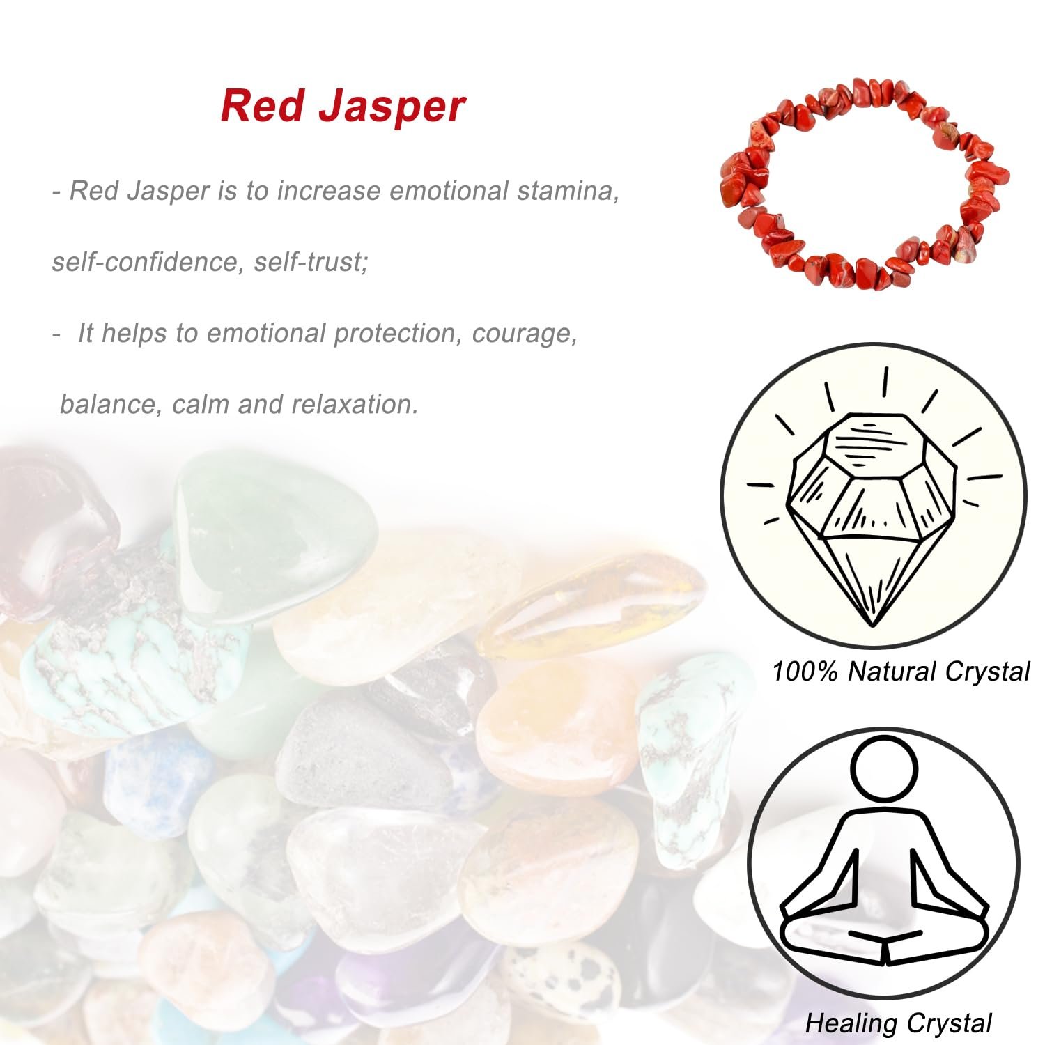 - Natural: You will receive 1pcs natural red jasper bracelet. Red jasper is to increase emotional stamina, self-confidence, self-trust. It helps to emotional protection, courage, balance, calm and relaxation.
