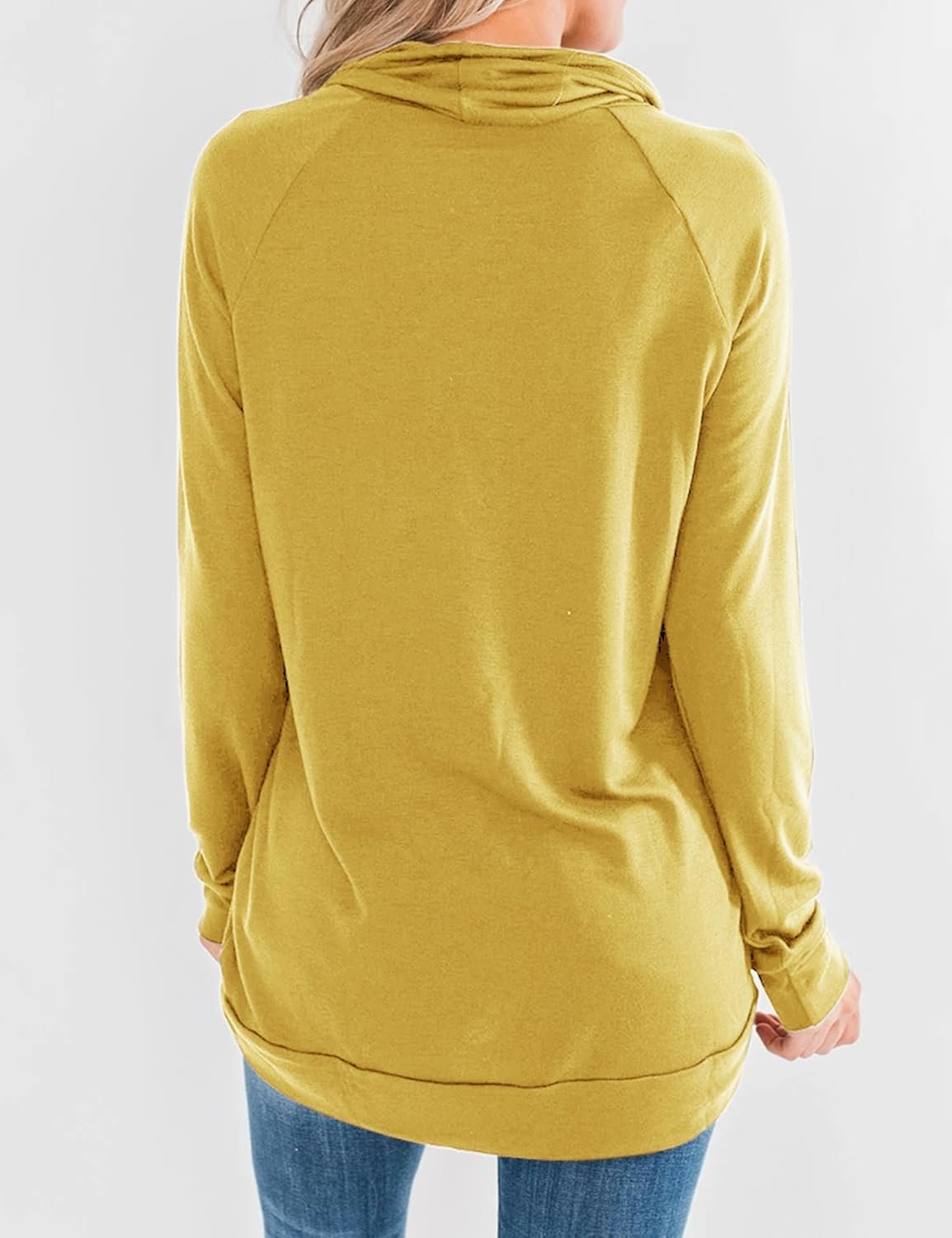 - Cowl neck sweater with an adjustable drawstring and unique double bottom band design! This sweater is the perfect mixture of cute and casual!