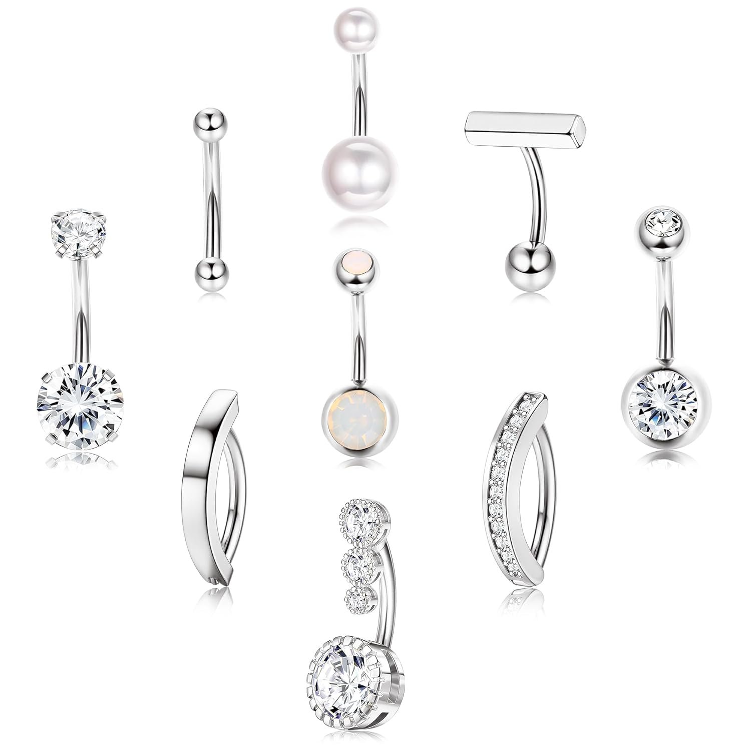 FIBO STEEL 8Pcs Stainless Steel Dangle Belly Button Rings for Women Evil Eye CZ Navel Rings Barbell CZ Body Piercing Jewelry 14G