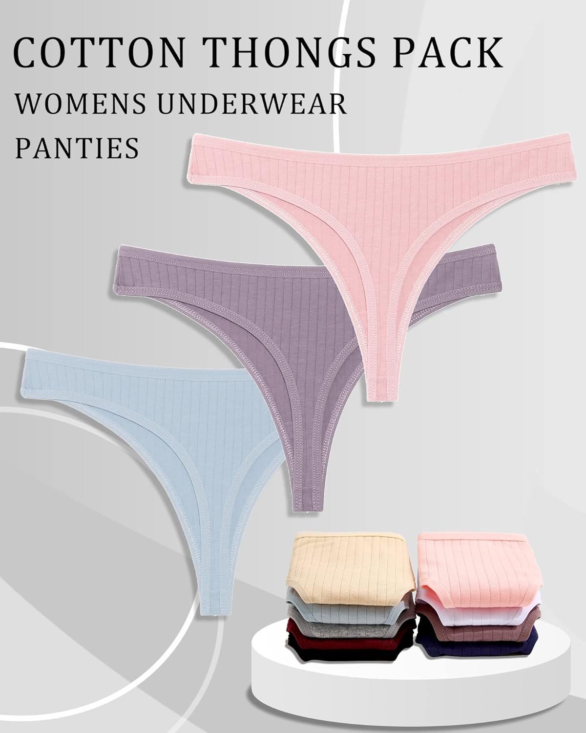 - Cotton Thongs for Women: 95% premium cotton, 5% spandex. Crotch inner lining: 100% cotton. Comfortable and breathable fabric with ribbed texture is more lovely and cute. When you wear it once, you will buy it again and totally recommend it. If you want to try different styles panties, just start with a simple and cute cotton thongs.
