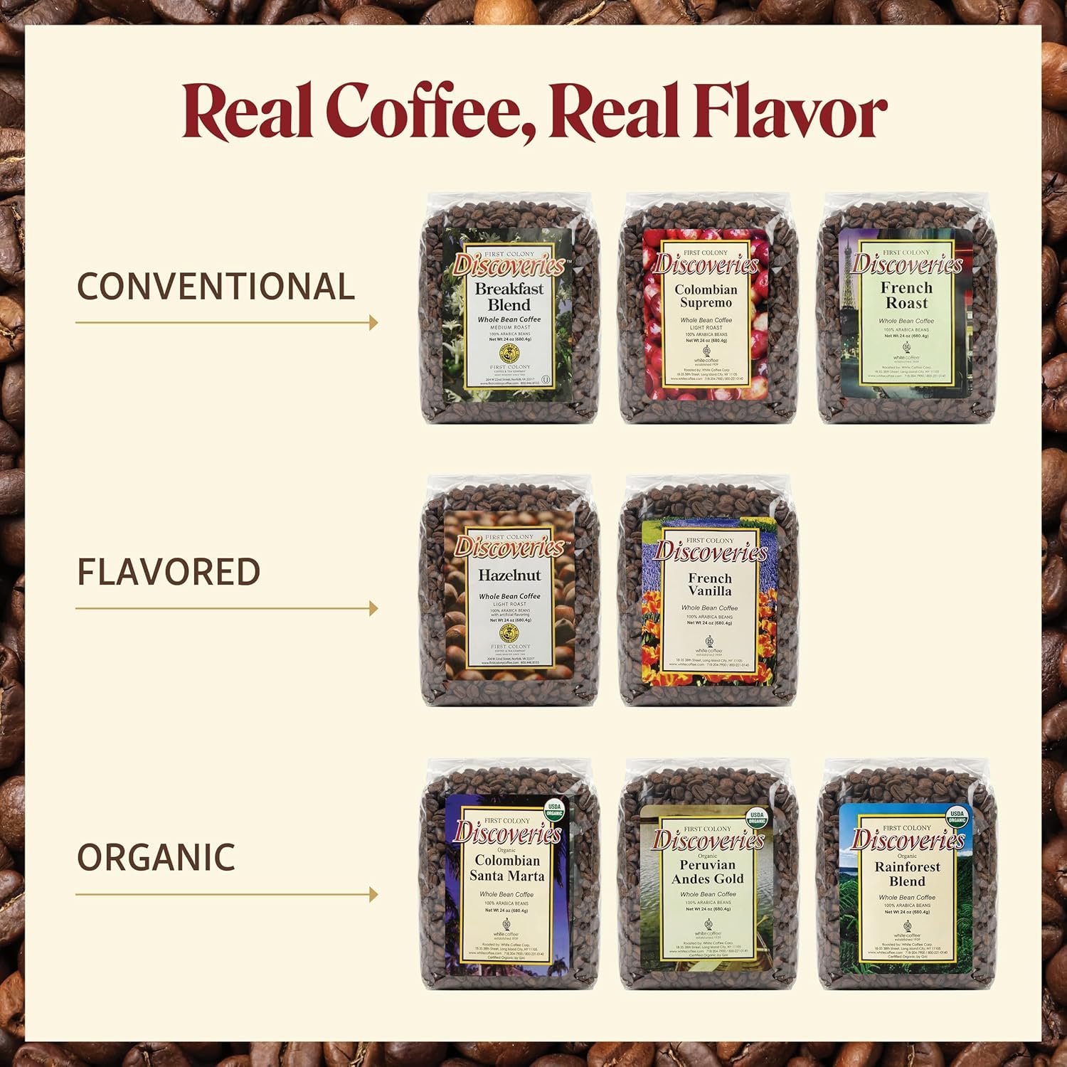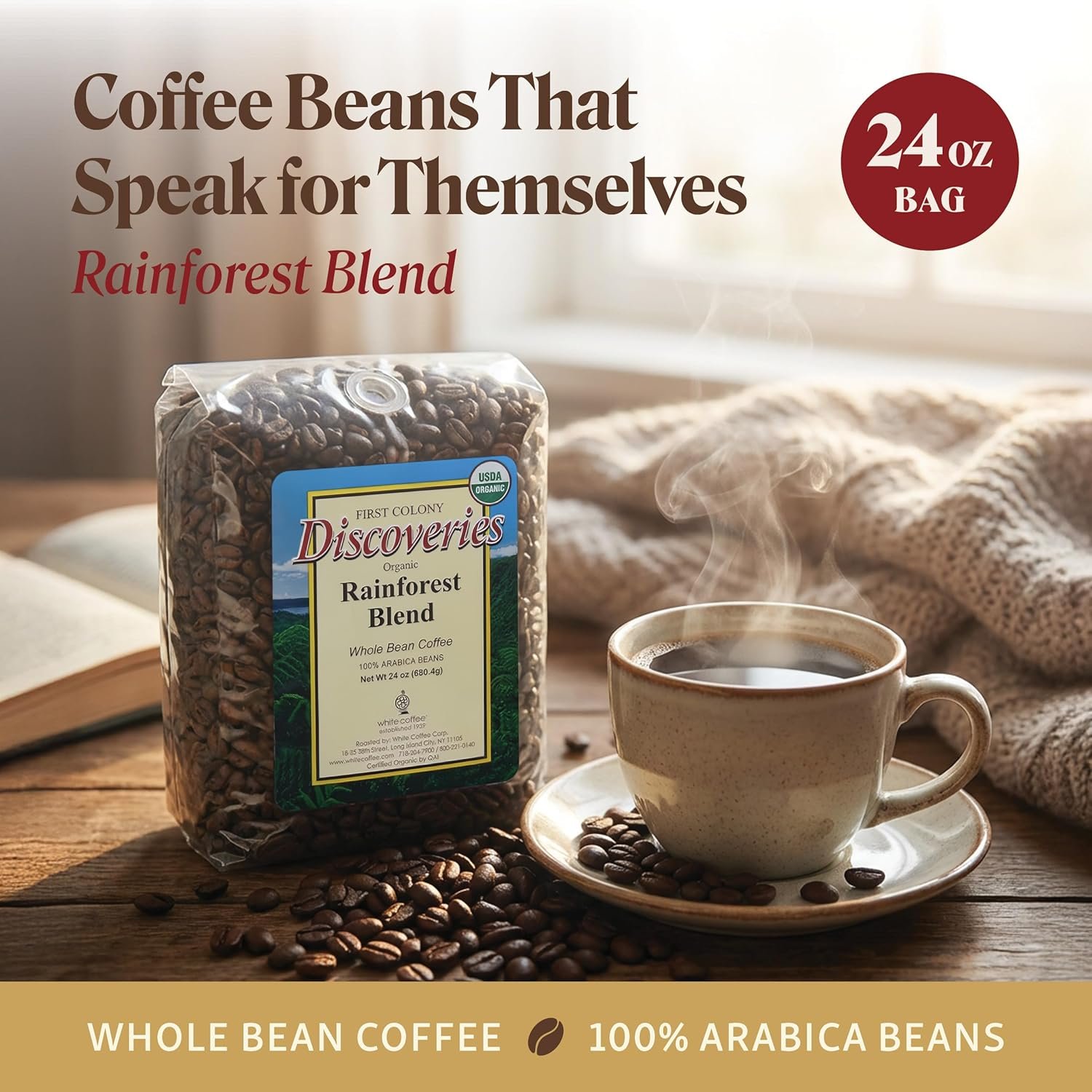 9 reviews for First Colony Organic Whole Bean Coffee, Rainforest Blend, Medium Roast, USDA Organic, 100% Arabica Beans, 24oz Bag for Home Brewers & Cafés, Hand-Roasted in the USA Since 1902