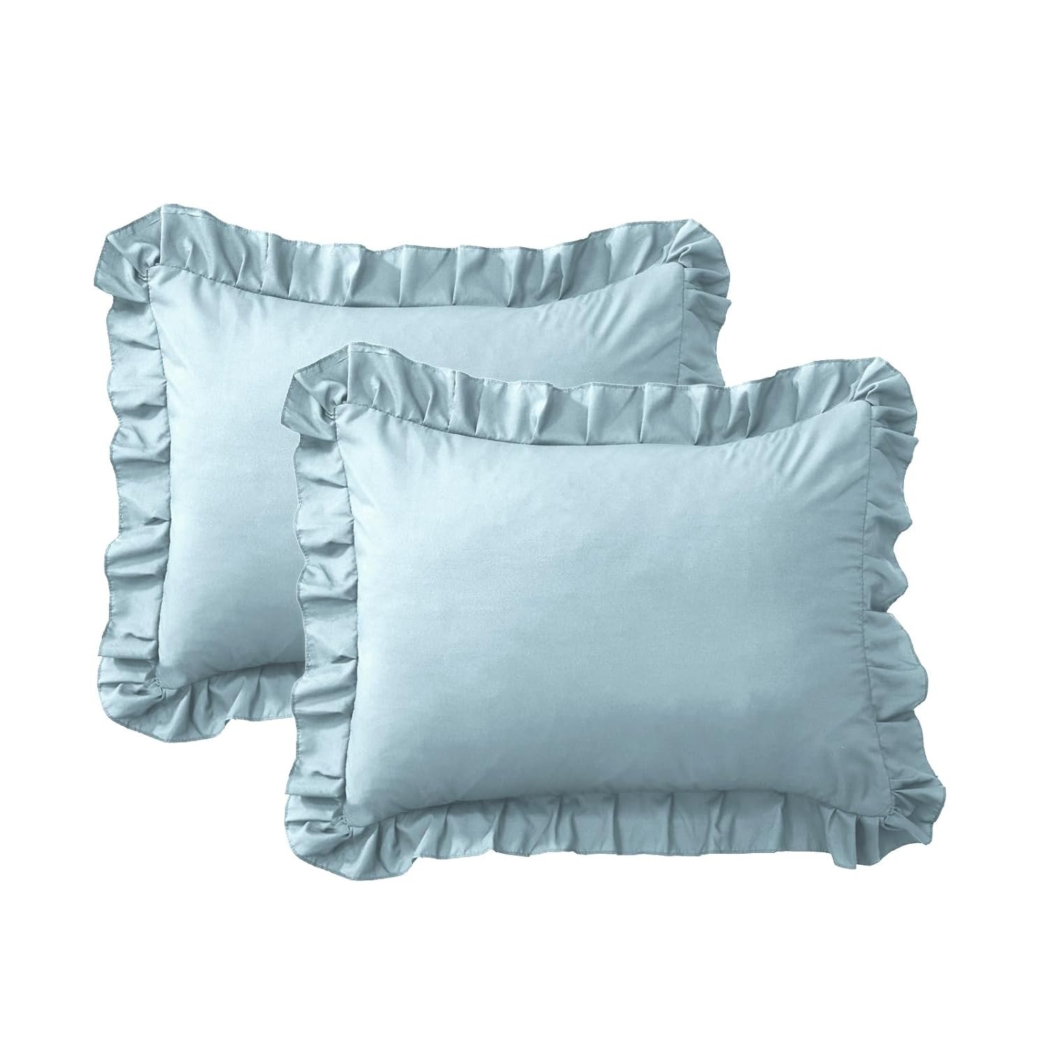 These ruffle pillowcases are absolutely lovely. The baby blue color is soft and soothing, and the ruffled edges add such a charming, elegant touch. The microfiber fabric feels smooth and comfortable, and they fit king-size pillows perfectly. I love the envelope closure, it keeps everything looking neat. They wash well with no wrinkles or fading. Great quality for the price and they make the bed look so pretty. I’m completely in love with them!