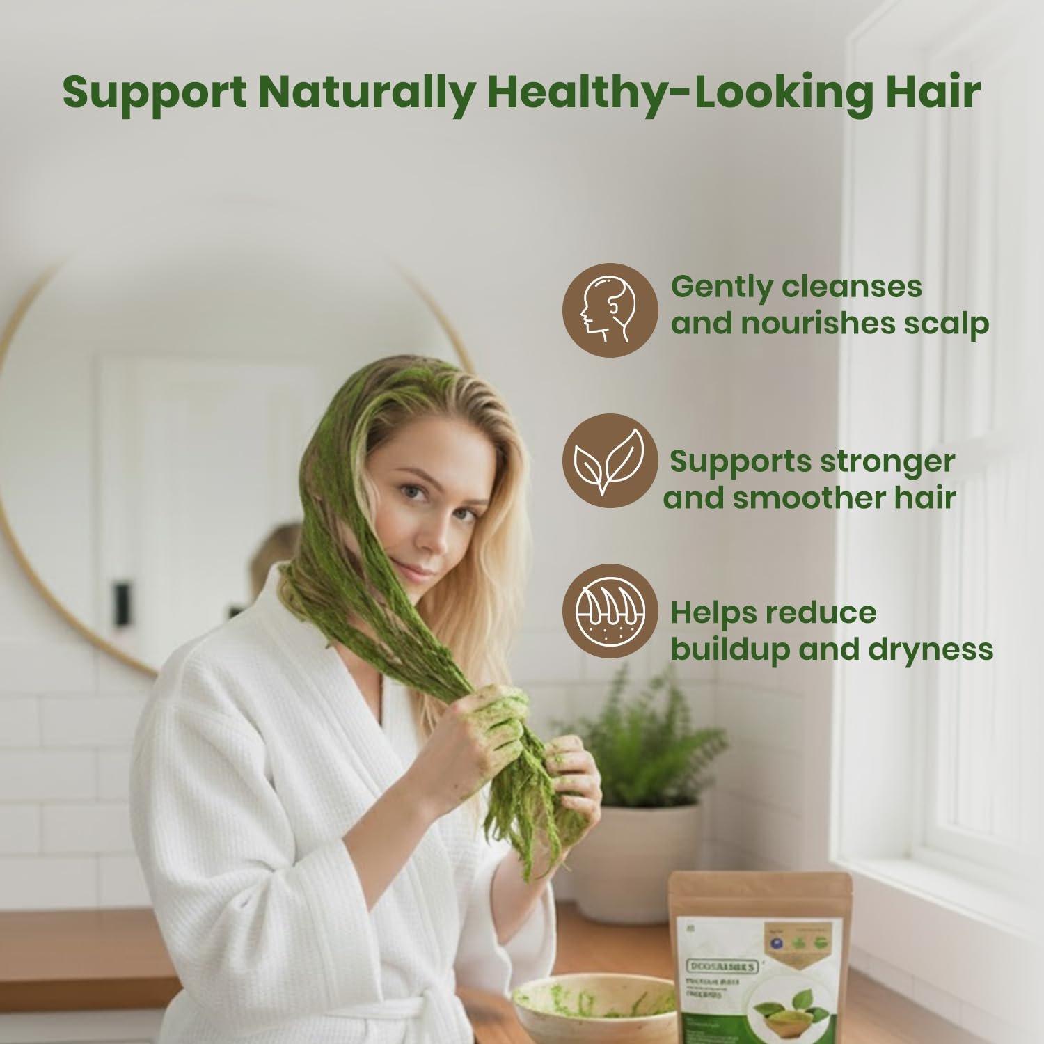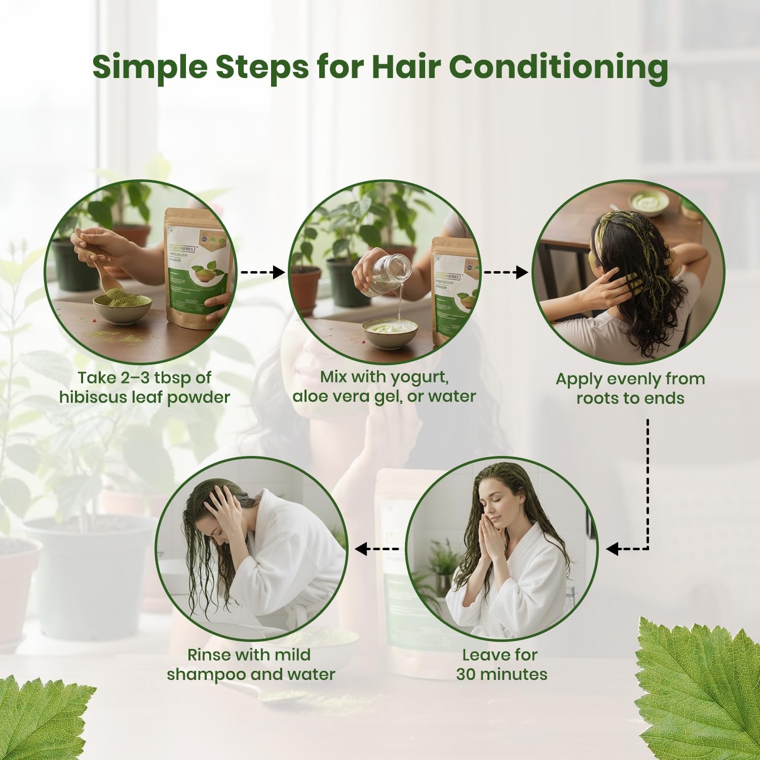 - MAKE YOUR OWN NATURAL SHAMPOO: Take 3 teaspoons of hibiscus leaf powder, mix it with water and make it into a paste consistency, then mix 1 teaspoon of hibiscus flower powder (natural hair conditioner) with it. Now apply the paste on your hair, leave it for 5 minutes, and rinse it. This hibiscus shampoo will not strip the hair of natural oils and can be safely used for very young babies too.