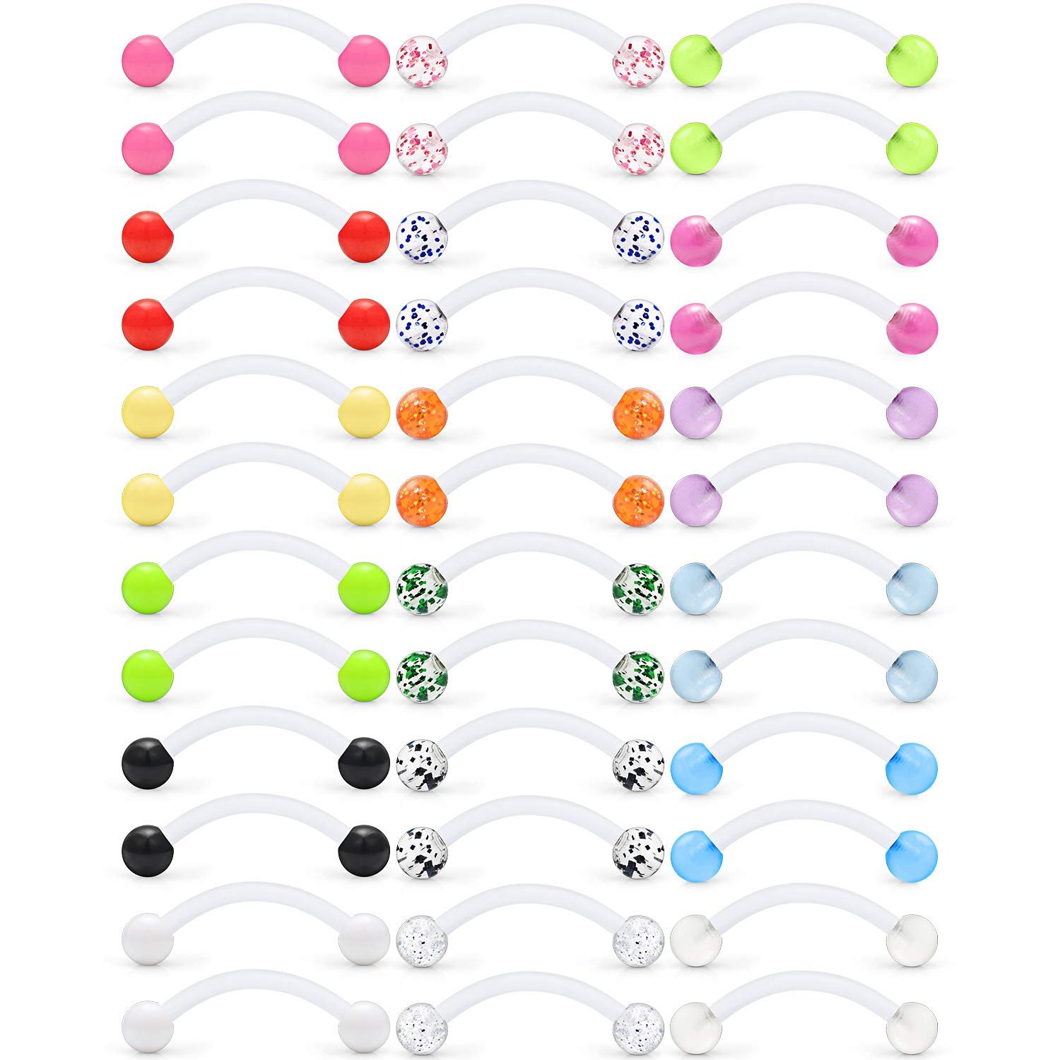 - Each Order Includes 18 Pairs 14 Gauge Flexible Acrylic Externally Threaded Curved Barbell Snake Eyes Tongue Ring Body Piercing Jewelry Retainers, Which are Glow in the Dark Ball, Glitter Ball, Solid Color Ball, Each Style 6 Pairs.