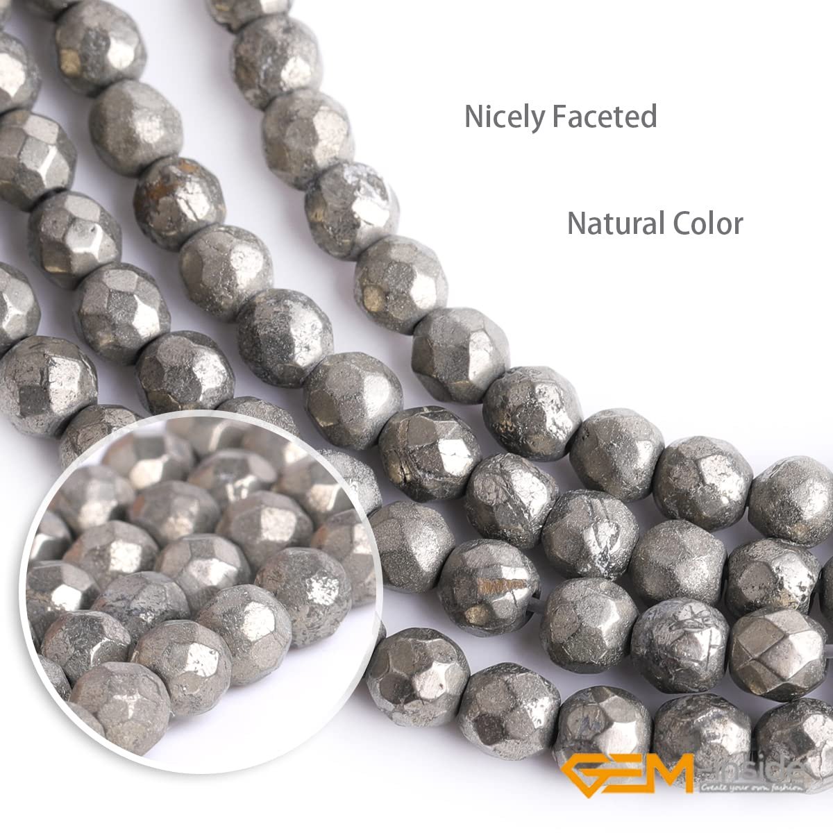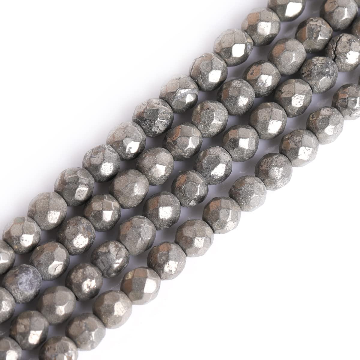 - Processed From Gray Pyrite Stone.Round shape,consistency color and faceted surface.Size :4mm. Q’ty :95-100 Beads Per Strand (15 inch),Hole size:1mm