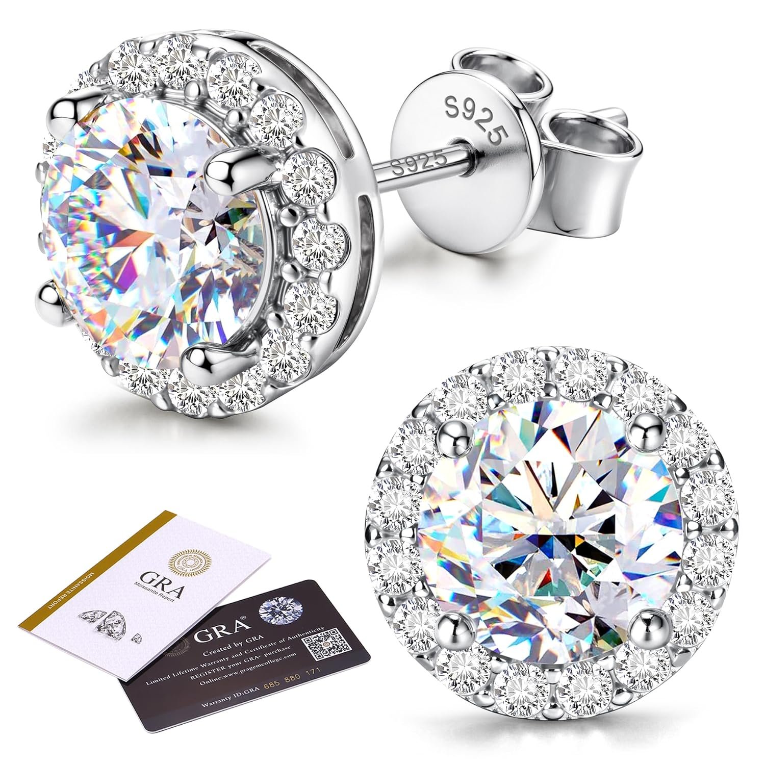 - Detail of Moissanite Earrings Studs : The moissanite halo earrings crafted with 7.5mm(1.5ct) brilliant round cut D color, VVS1 clarity moissanite, securely prong design. With a post length of 11mm and a post diameter of 0.8mm(20G), these dainty sterling silver jewelry are perfect as first, second, third Lobe hole earrings studs, suitable for both men and women