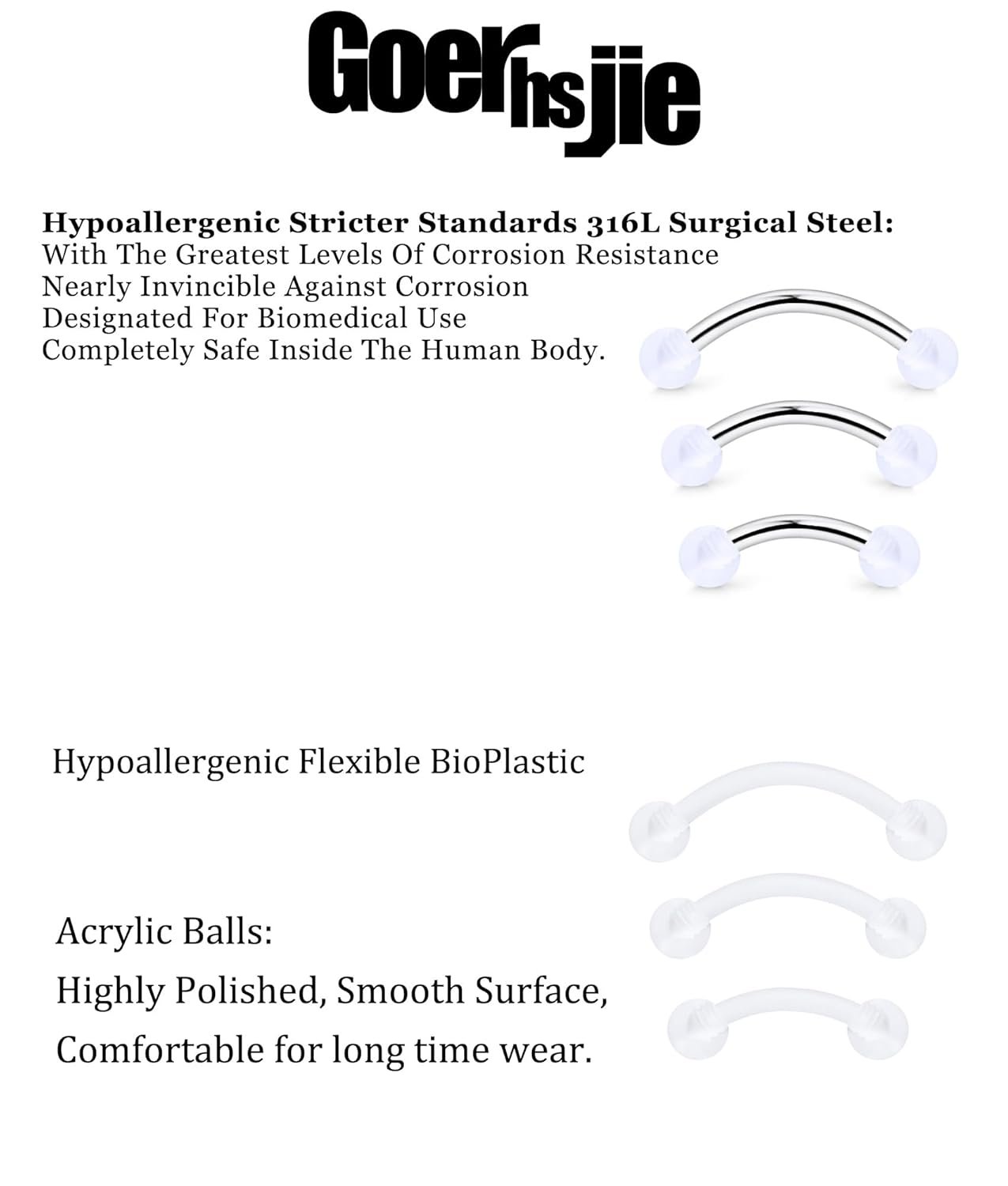 Goerhsjie 16g 6/8/10mm White/Pink/Black Eyebrow/Rook/Snug/Vertical-Labret/VCH/Snake-Eyes/Anti-Tragus/Christina/Daith/Belly-Button/Bridge/Hood/Surface Curved Barbell Piercing…