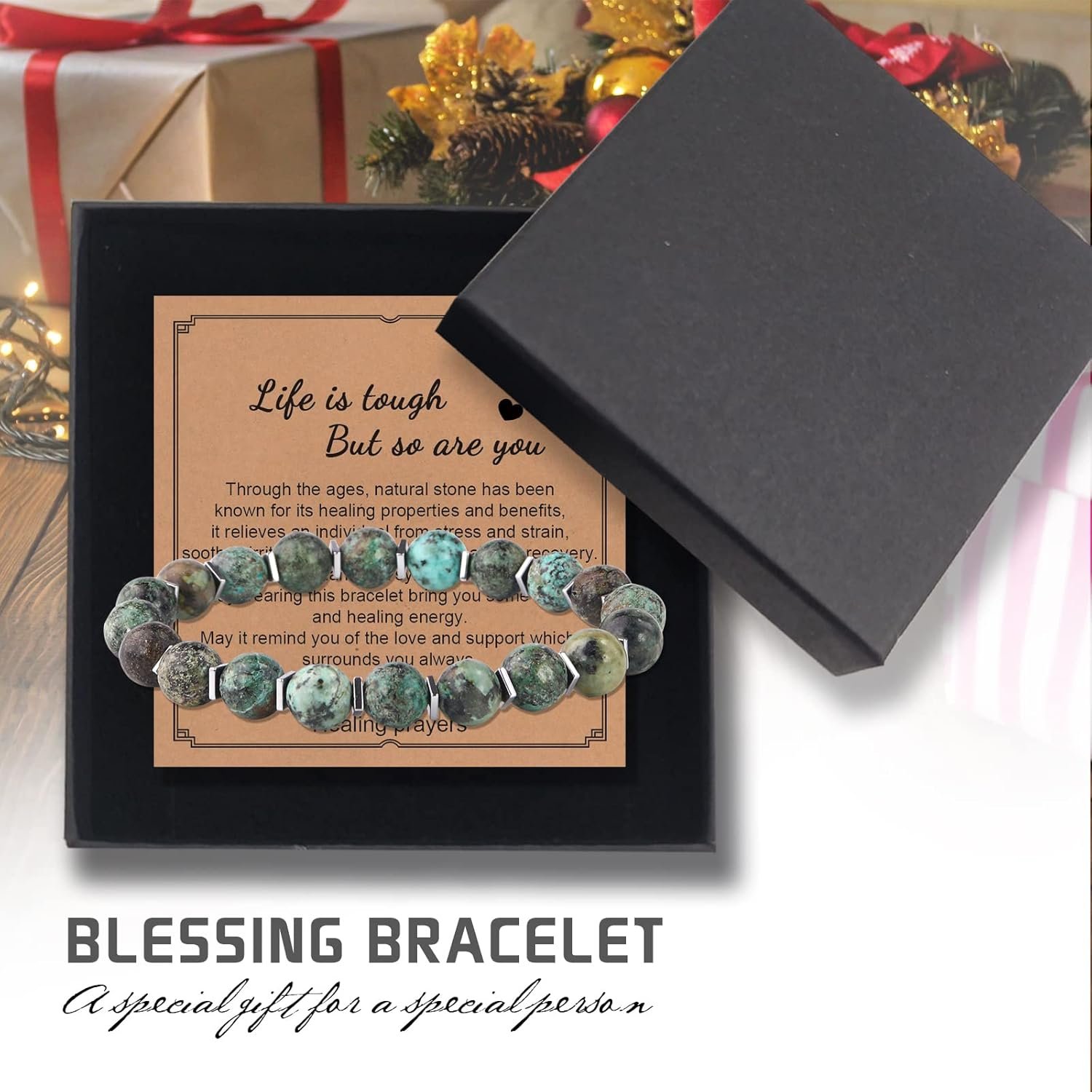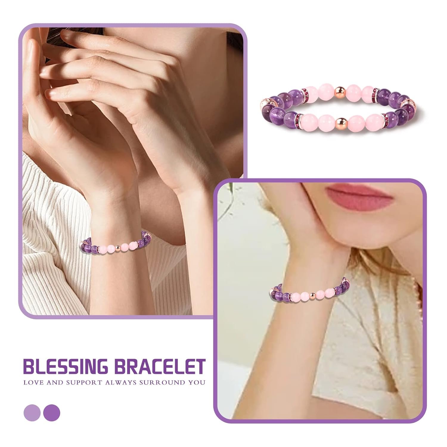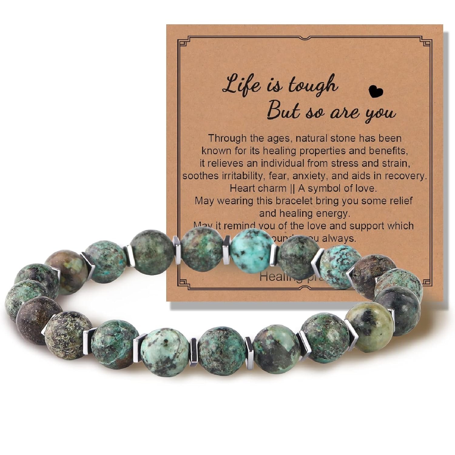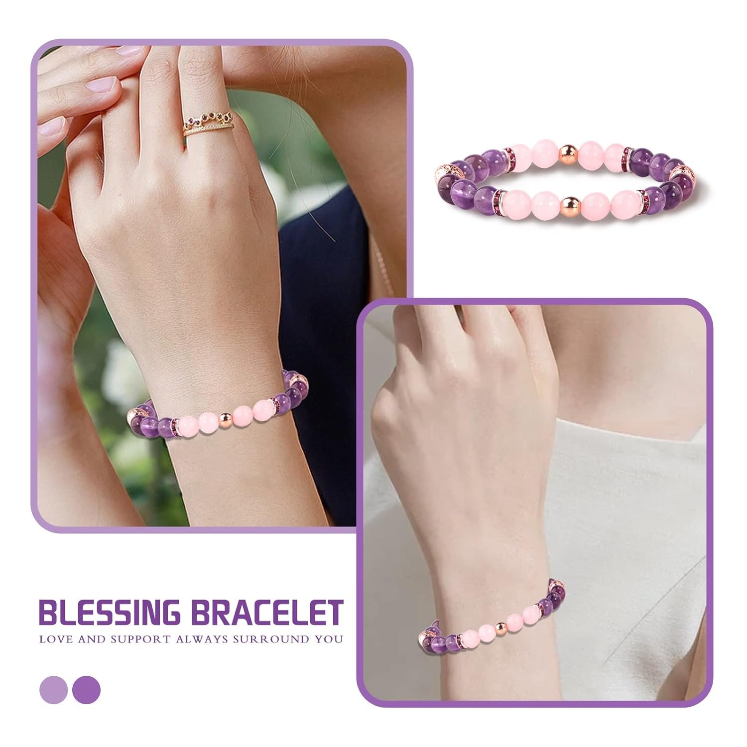 Really like the concept, appearance and sentiment. Bought two. Was not pleased they varied significantly in color. But worse, one broke – not the elastic, but one of the gem spacers- shortly after receiving it…