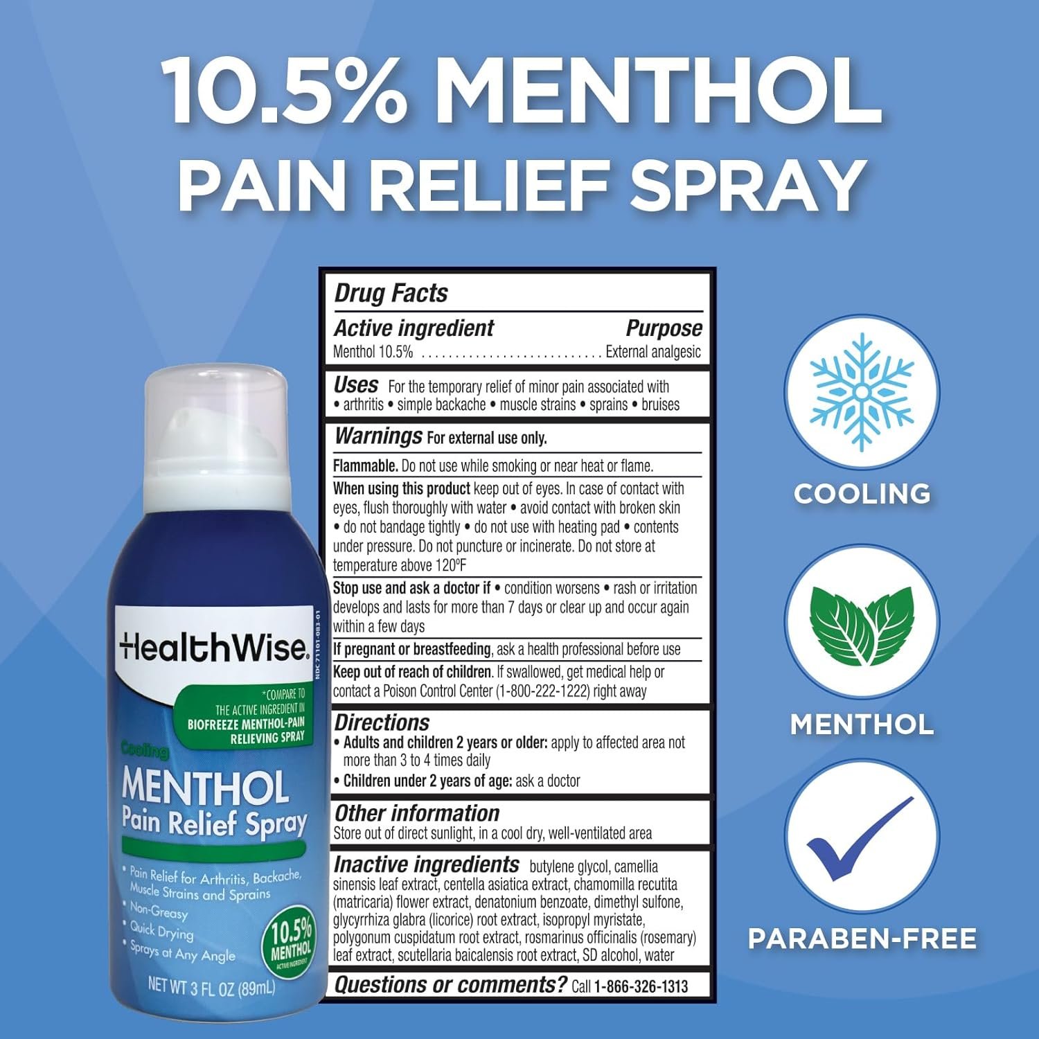 HealthWise 10.5% Menthol Pain Relief Spray | Cold Hot Sensation | 3 oz. 85 mL | Non-Greasy Formula | Immediate Penetrating Action | External Analgesic