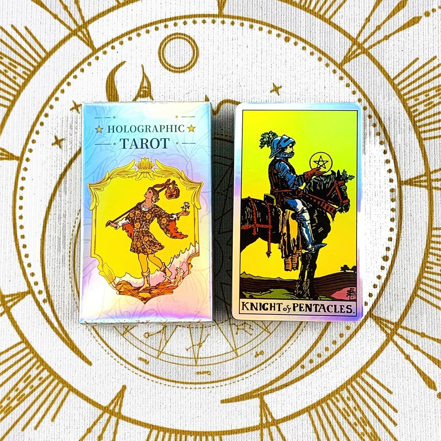 NOTE: The title of this item is incorrect. This product is a set of holographic tarot cards. The artwork on the tarot cards is excellent, but keep in mind that this is a smaller-than-usual deck. Most tarot cards are quite large and take up quite a bit of table space if you want to do a read, but these are smaller so they will work with a reduced footprint. The cards themselves shimmer with foil kind of loveliness, and the artwork is classic tarot artwork. Highly recommended.